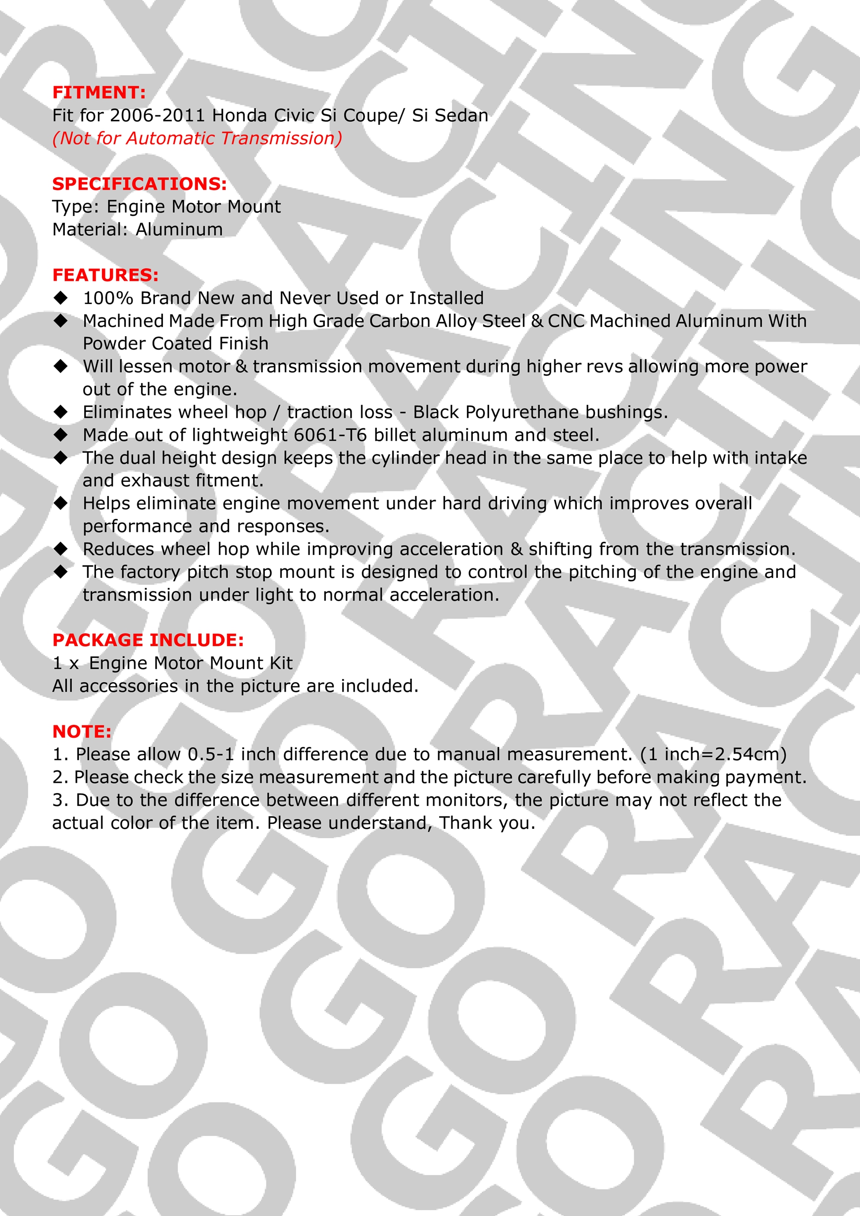 Billet Swap Engine Motor Mount Kit Replacement For 06-11 Civic Si Race K20 K24