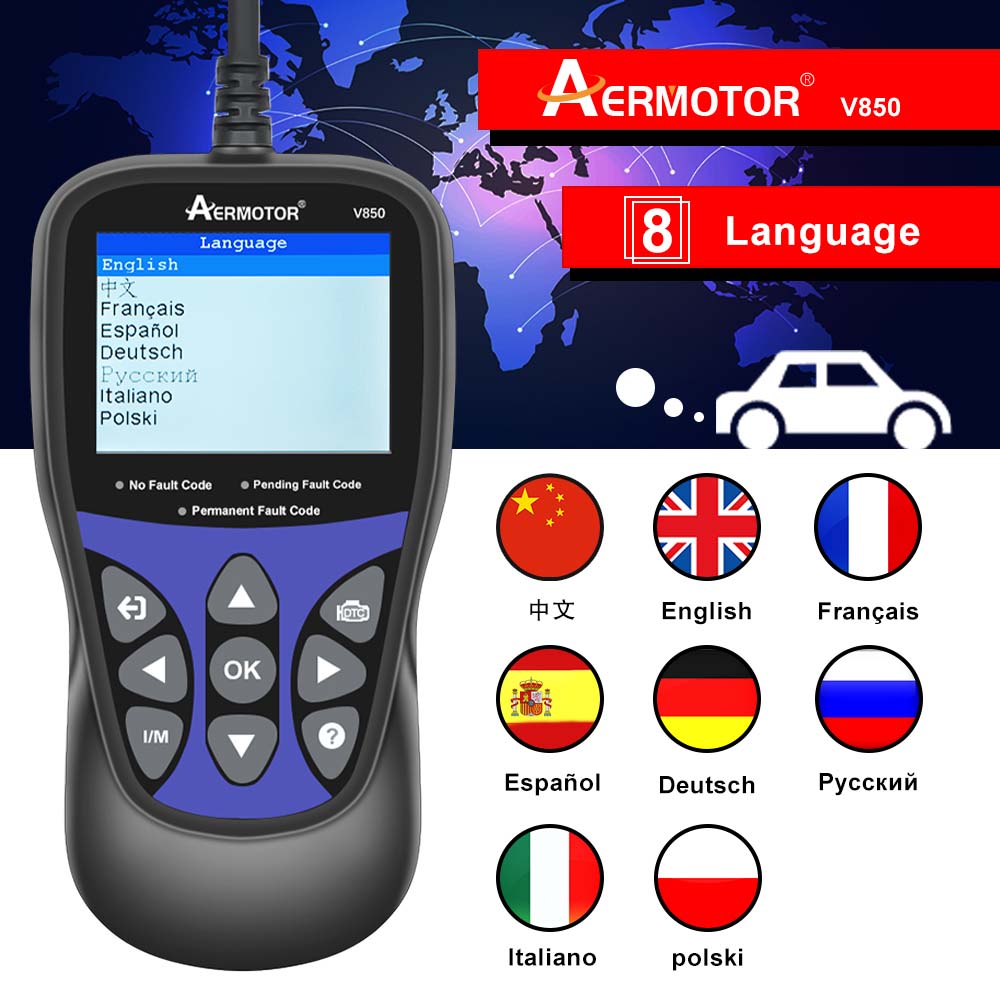 AERMOTOR V850 OBDII/EOBD Scanner supports all 10 modes of OBDII test for a complete diagnosis. Featuring the unique One-Click I/M Readiness Key, TFT color display and built-in speaker, the V850 is truly the ultimate in power and affordability, allowing users to do their jobs faster. In addition, thousands of troubleshooter code tips help technicians to save diagnosis and repair time.