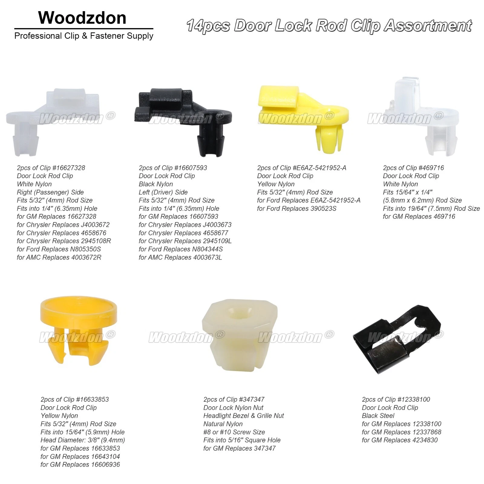 Package includes: 14pcs Door Lock Rod Clip Assortment, Replaces for Dorman 75450 2pcs of Door Lock Rod Clip, White Nylon, for GM 16627328 2pcs of Door Lock Rod Clip, Black Nylon, for GM 16607593 2pcs of Door Lock Rod Clip, White Nylon, for GM 469716 2pcs of Door Lock Rod Clip, Yellow Nylon, for Ford E6AZ-5421952-A 2pcs of Door Lock Rod Nut, Yellow Nylon, for GM 16633853 2pcs of Door Lock Rod Nut, White Nylon, for GM 347347 2pcs of Door Lock Rod Clip, Black Steel, for GM 12338100 2pcs of Clip #16627328, Door Lock Rod Clip, White Nylon, Right (Passenger) Side, Fits 5/32" (4mm) Rod Size, Fits into 1/4" (6.35mm) Hole, for GM 16627328, for Chrysler J4003672, for Chrysler 4658676, for Chrysler 2945108R, for Ford N805350S, for AMC 4003672R 2pcs of Clip #16607593, Door Lock Rod Clip, Black Nylon, Left (Driver) Side, Fits 5/32" (4mm) Rod Size, Fits into 1/4" (6.35mm) Hole, for GM 16607593, for Chrysler J4003673, for Chrysler 4658677, for Chrysler 2945109L, for Ford N804344S, for AMC 4003673L 2pcs of Clip #E6AZ-5421952-A, Door Lock Rod Clip, Yellow Nylon, Fits 5/32" (4mm) Rod Size, for Ford E6AZ-5421952-A, for Ford 390523S 2pcs of Clip #469716, Door Lock Rod Clip, White Nylon, Fits 15/64" x 1/4" (5.8mm x 6.2mm) Rod Size, Fits into 19/64" (7.5mm) Rod Size, for GM 469716 2pcs of Clip #16633853, Door Lock Rod Clip, Yellow Nylon, Fits 5/32" (4mm) Rod Size, Fits into 15/64" (5.9mm) Hole, Head Diameter: 3/8" (9.4mm), for GM 16633853, for GM 16643104, for GM 16606936 2pcs of Clip #347347, Door Lock Nylon Nut, Headlight Bezel & Grille Nut, Natural Nylon, #8 or #10 Screw Size, Fits into 5/16" Square Hole, for GM 347347 2pcs of Clip #12338100, Door Lock Rod Clip, Black Steel, for GM 12338100, for GM 12337868, for GM 4234830 Product Name: Door Lock Rod Clip, Rod End Clip, Door Lock Pawl, Door Handle Rod End Clip, Tailgate Handle Rod Clip; Other Names: Door Lock Rod End Clip, Door Handle Door Lock Rod Clip, Tailgate Handle Rod End Clip, Tailgate Handle Door Lock Rod Clip, Door Latch Cable Clip