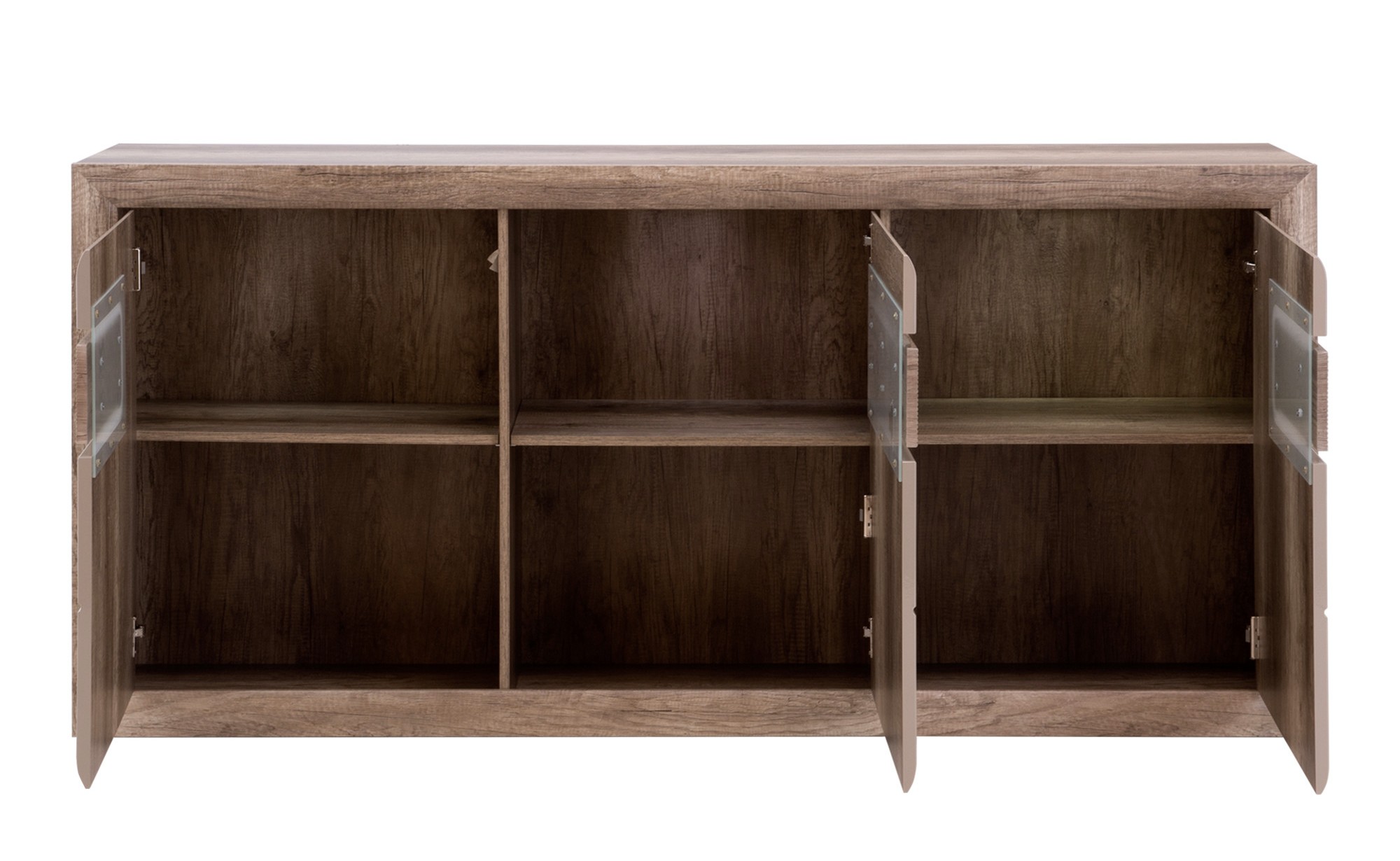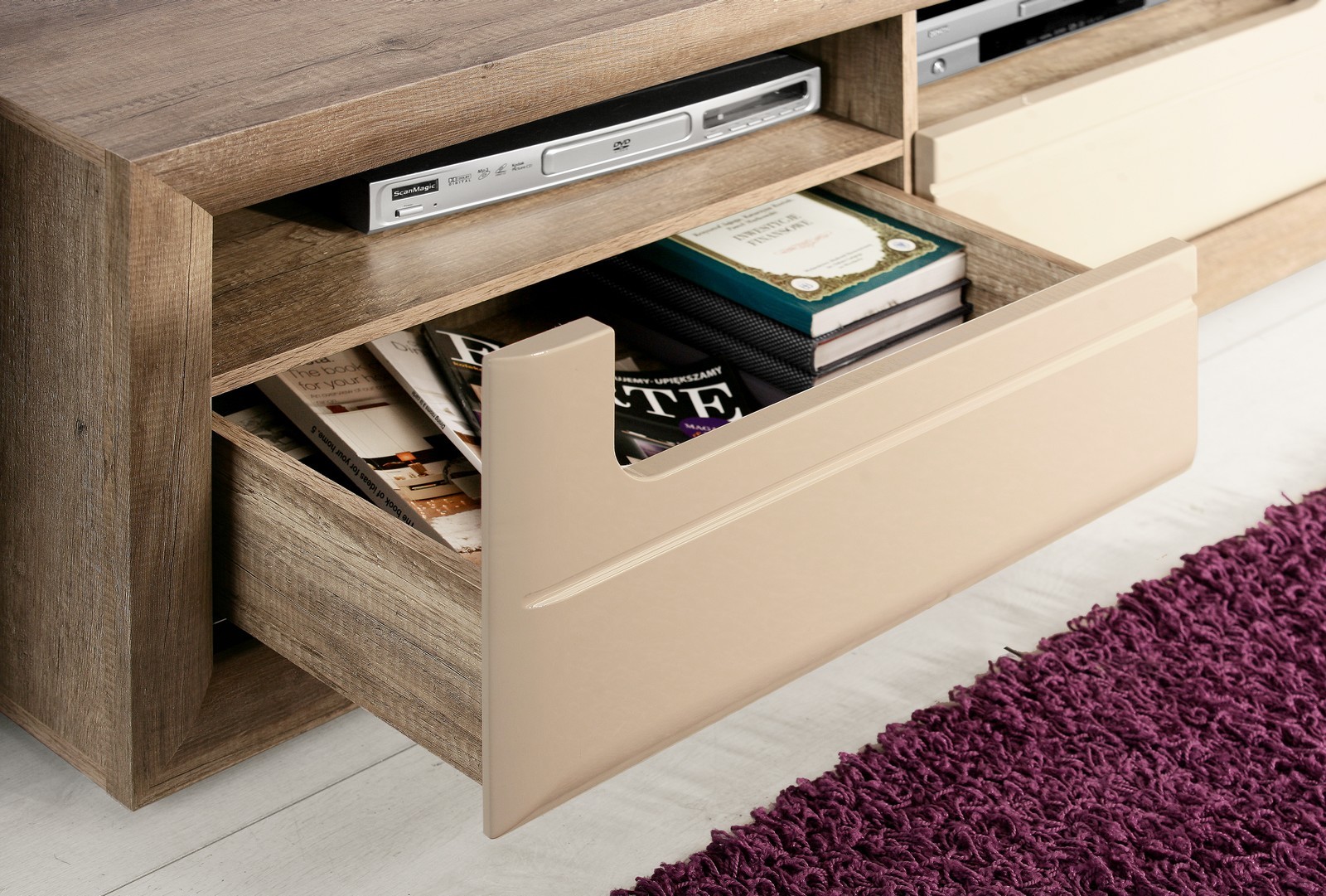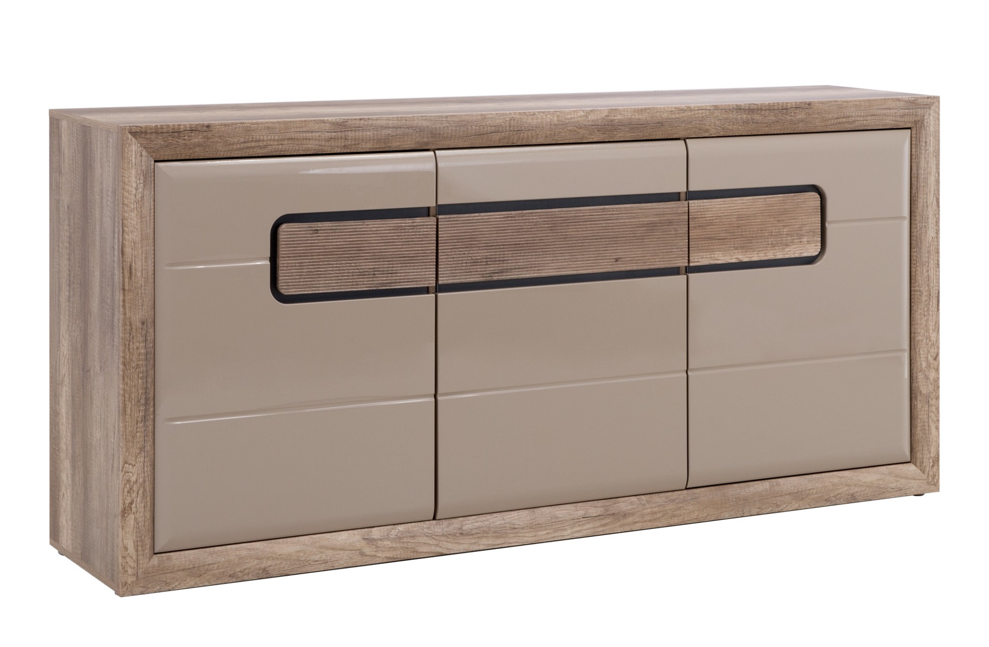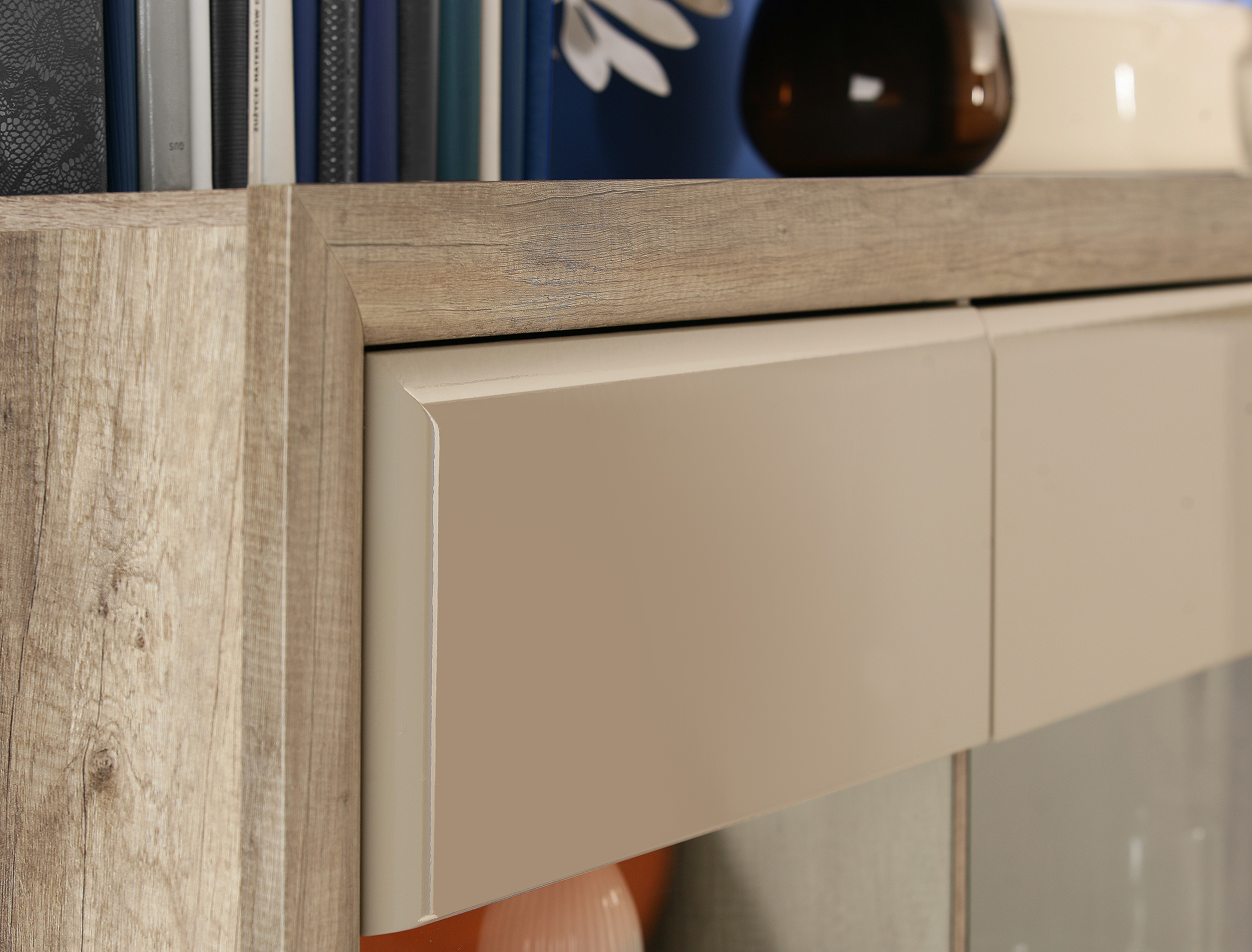 Die Tiziano Kollektion sind sehr exklusive Möbel, für ein elegantes Arrangement des Wohn -und Esszimmers geschaffen. Die Möbel sind ein perfektes Beispiel für die Kombination von modernem Design und warmen, visuell einladenden Farben. Die Rahmen der Möbel sind aus Eiche Antike Dekor, was die natürliche Maserung des Holzes gut wiedergibt. In Gleichermaßen außergewöhnlichen, breiten, seitlichen Rahmen wurden die glänzenden, beigen Fronten, mit abgerundeten Kanten, platziert. Das Design der Möbel betonen dekorativ, geriffelte Leisten in Form von Griffen, sowie dekorative Fräsen, die den Segmentbau der Fronten betonen. Ein moderner Akzent dieser Kollektion ist die im Standard erhältliche Innenbeleuchtung der Vitrinenglasregale und beleuchtete Griffe, die auch in der modernen Möbelbranche selten sind, und was perfekt den Raum vor allem am Abend belichtet. Die Möbelkollektion Tiziano befriedigt auch den anspruchsvollsten Geschmack. Sie ist eben wunderschön.