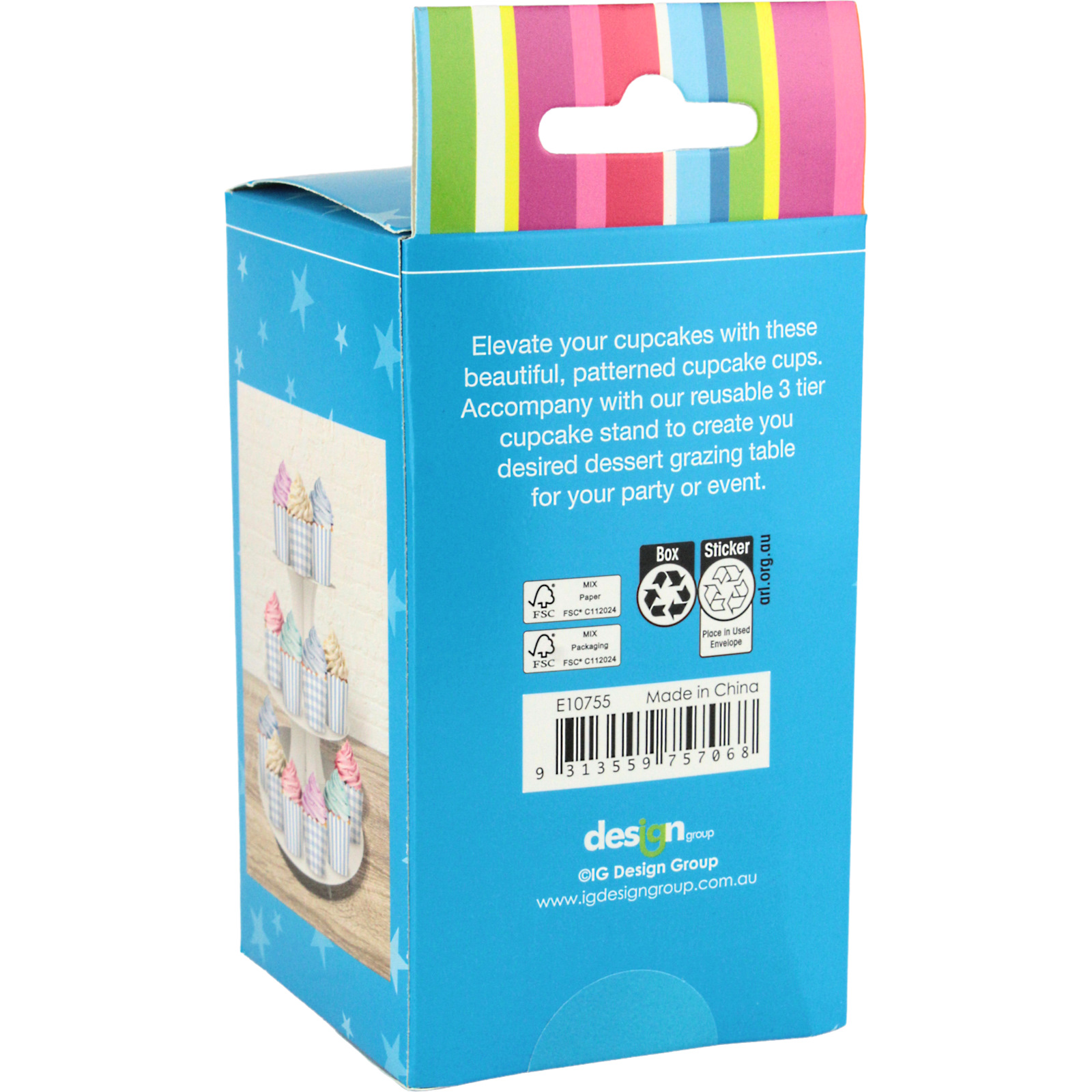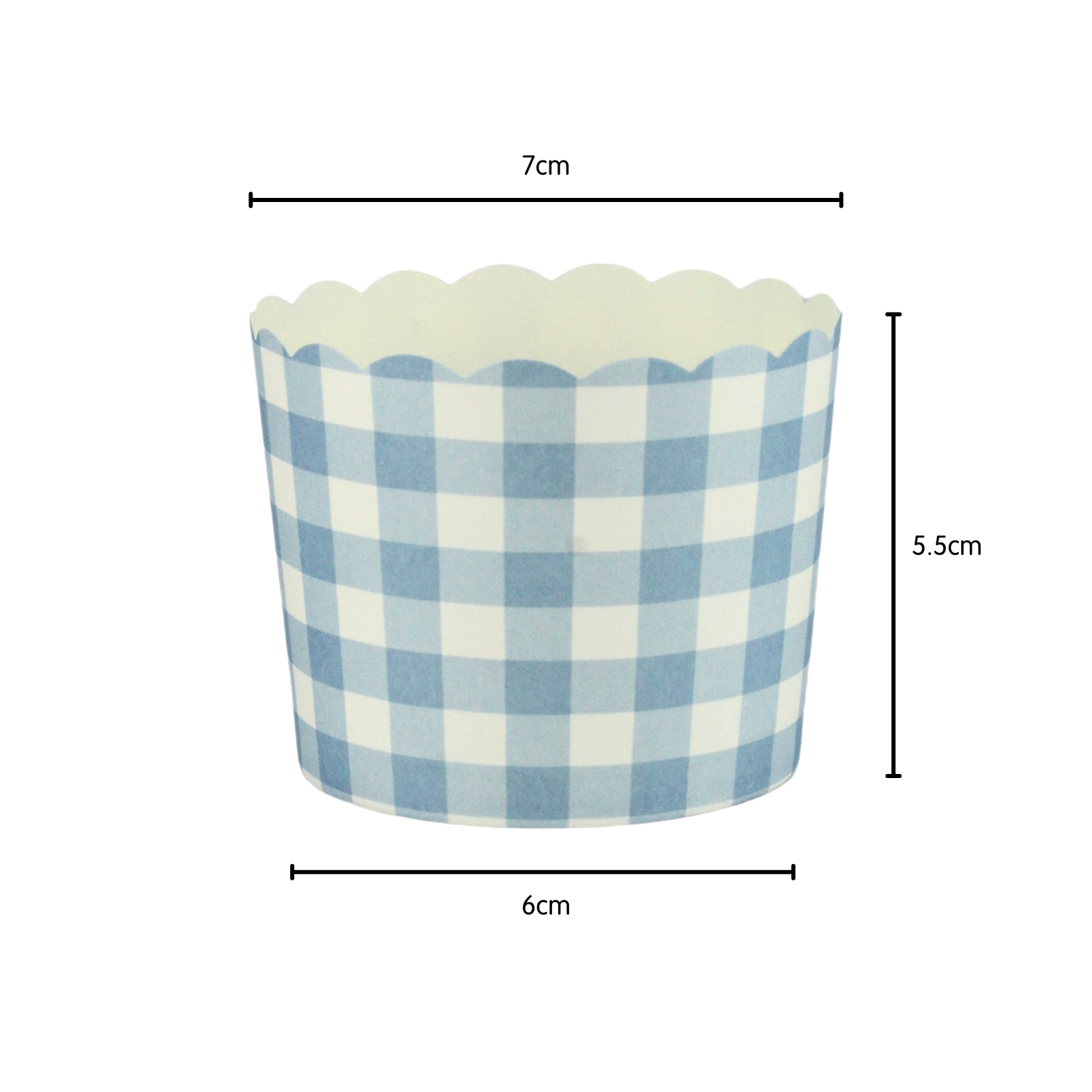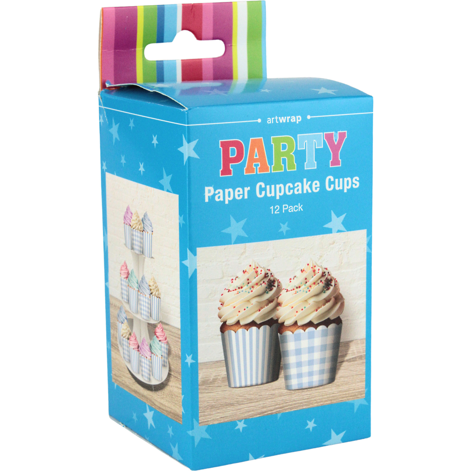 Pack of 12 Blue Gingham & Striped Baking Cups. Paper cupcakes and muffin liners with blue patterns.
