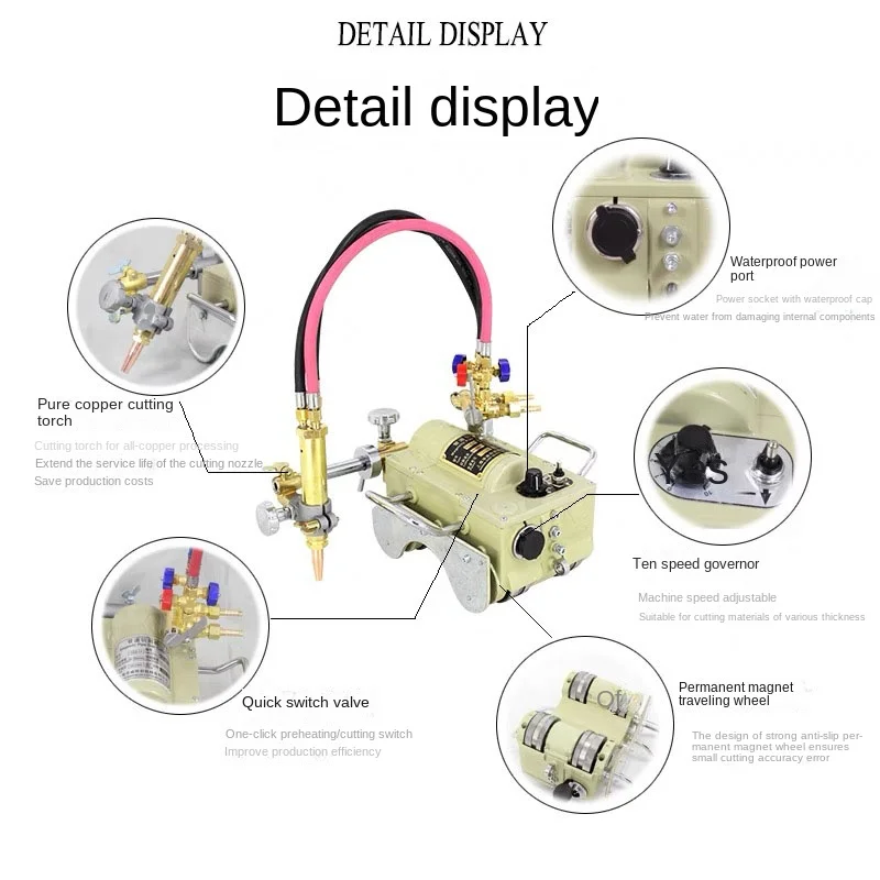 Machine model CG2-11 Overall dimensions: 350*310*180mm Machine weight 20KG Input voltage AC220/50HZ Cutting diameter ��108mm Cutting pipe wall thickness 6-50mm Cutting speed of steel plate 50-750mm/min Magnetic wheel adsorption force ��50KG