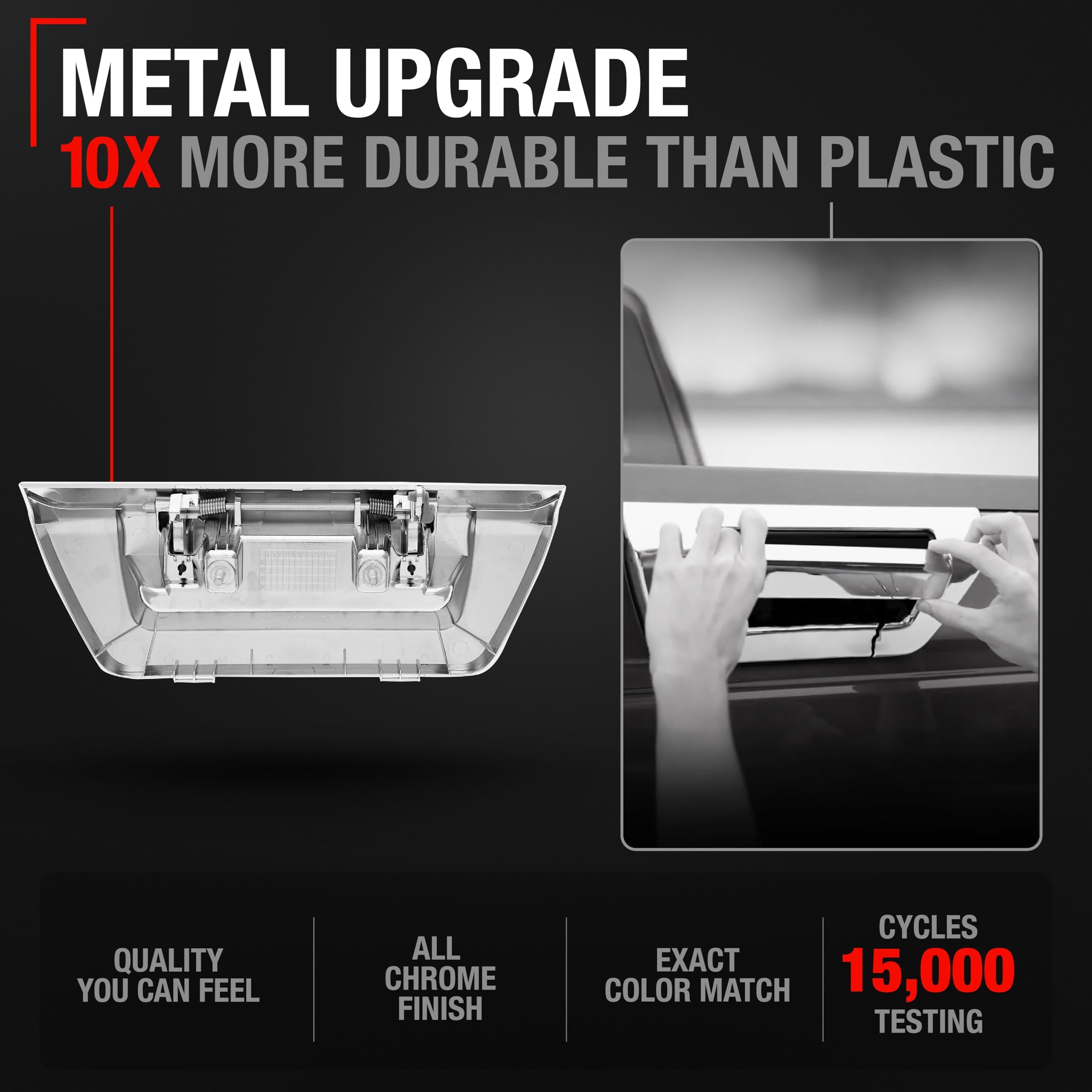 Enhance the functionality and aesthetics of your vehicle with our Tailgate Handle, compatible with 2015-2018 Ford F-150. This high-quality replacement part is designed to meet or exceed OEM standards with part number FL3Z-9943400-JA-ACHMT, 97694, ensuring a perfect fit and easy installation. Our tailgate handle is made from robust metal body with an all chrome finish that not only improves the functionality but also enhances the visual appeal of your vehicle. The handle is designed for easy installation, allowing you to quickly replace your existing handle and restore the integrity and security of your vehicle’s tailgate. Supported by a comprehensive 24-month warranty and expert US-based customer service, our product guarantees both quality and reliability.