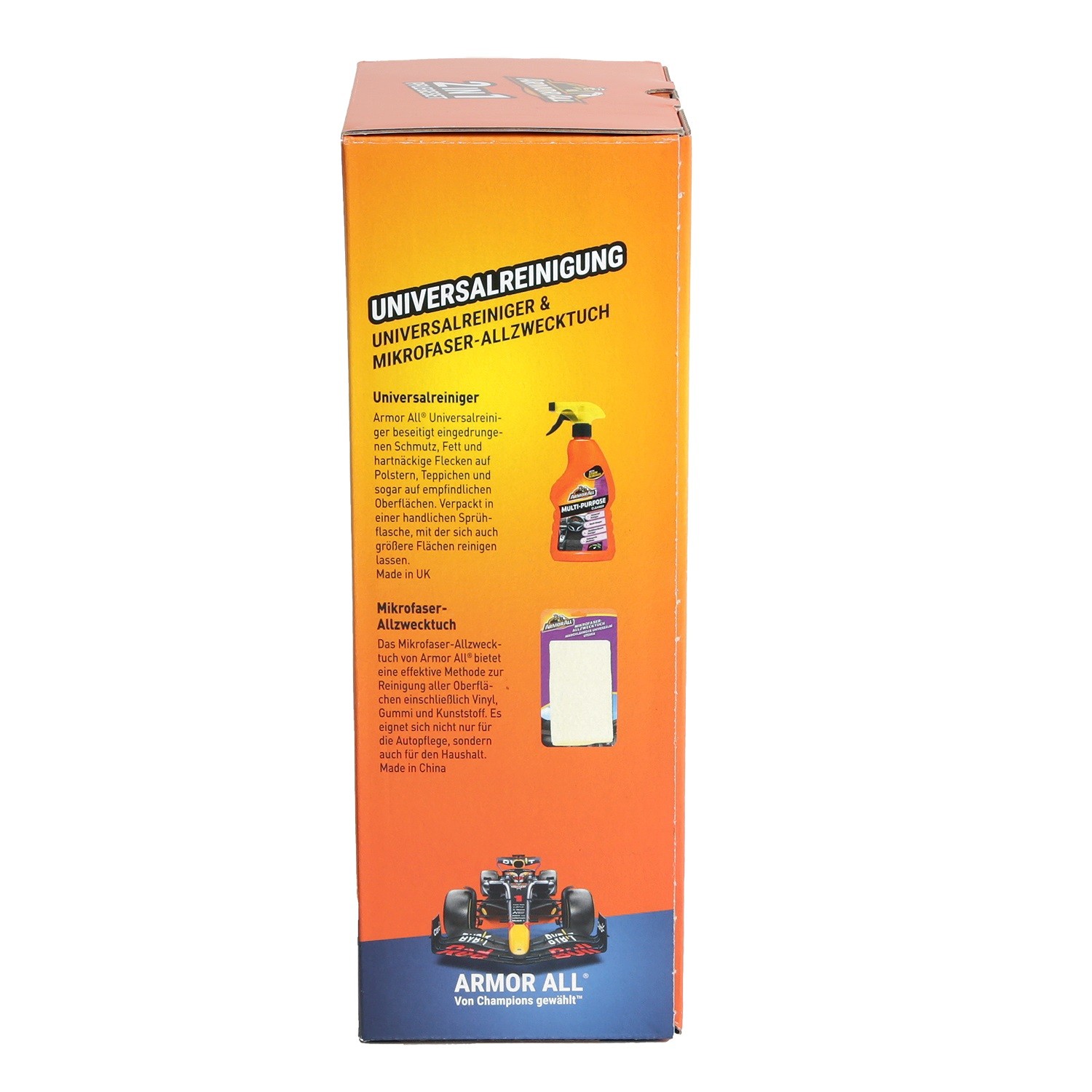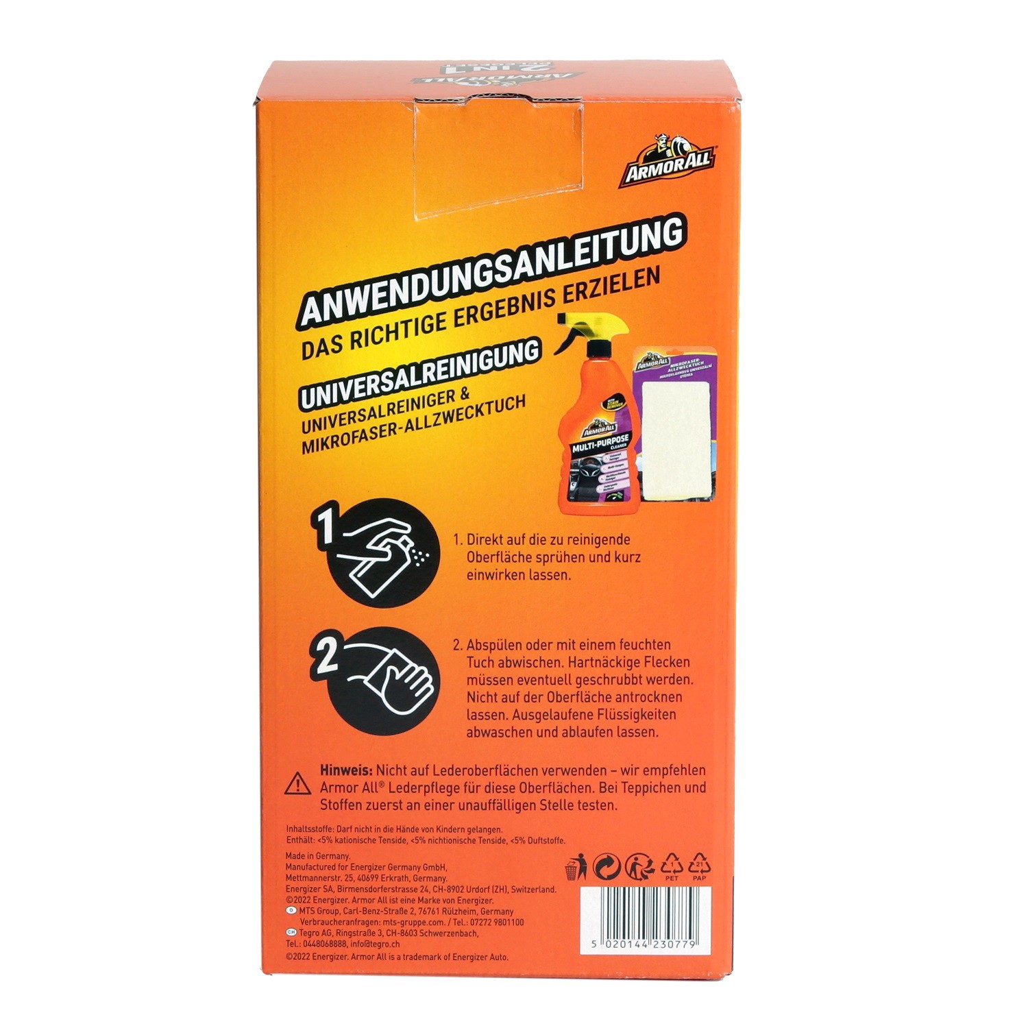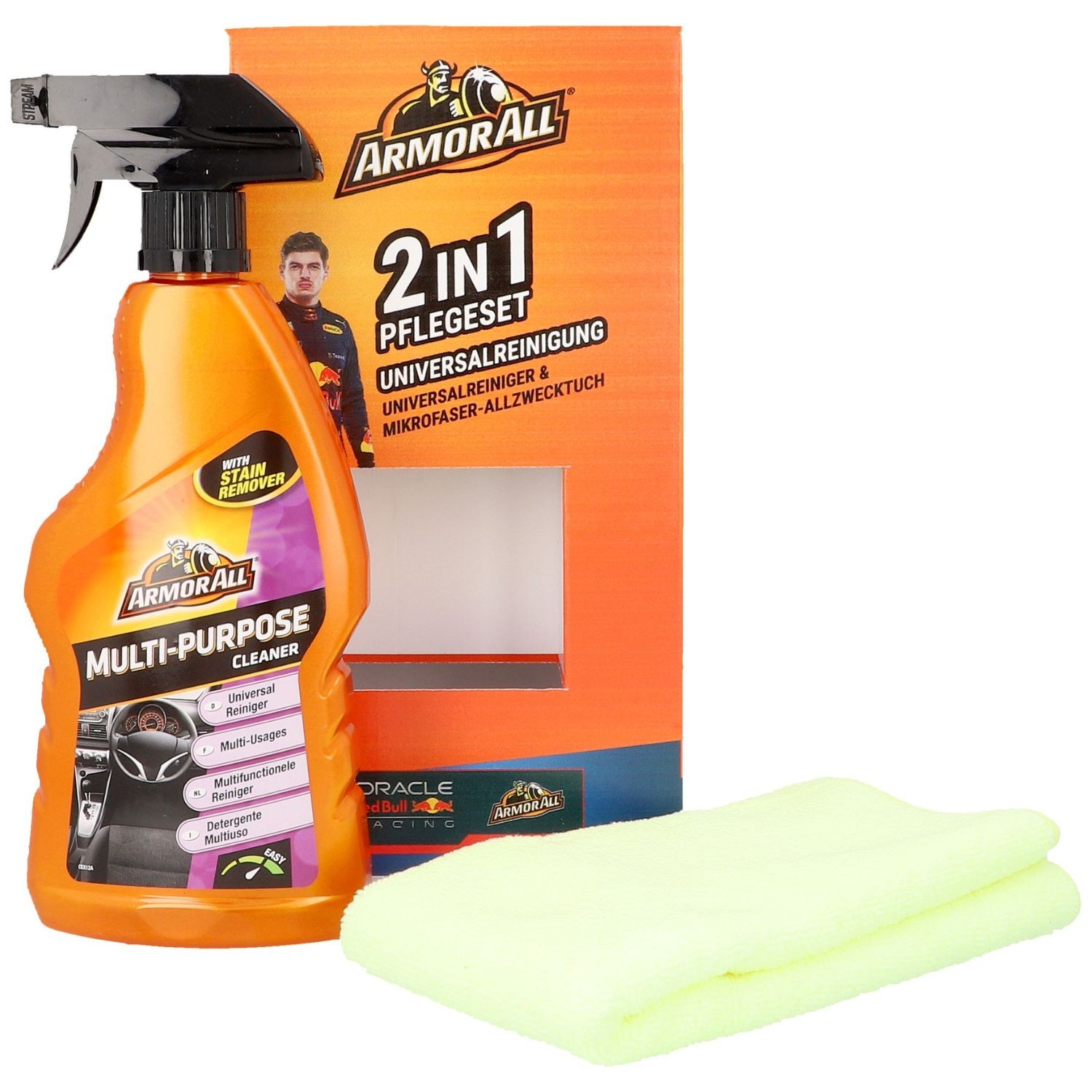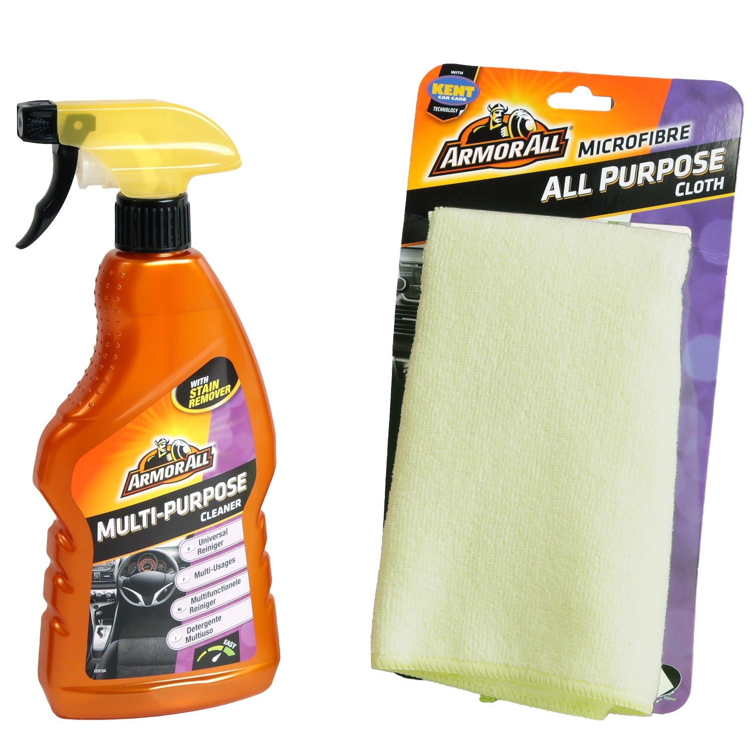 2-in-1 Pflegeset: Der Armor All Universalreiniger (Polster/Teppich) 500ml zusammen mit dem Mikrofaser-Allzwecktuch als unschlagbares Team gegen Schmutz, Verschleiß und Versprödung im Fahrzeuginnenraum.