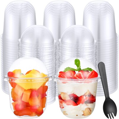 200 Pack Clear Plastic Cups Dessert Cups Yogurt Parfait Cups with Lids Clear Cups with Dome Lids Banana Pudding Cups Pet Disposable Cups with 200 Pcs Sporks for Fruit Ice Cream Party, No Hole(12 Oz)