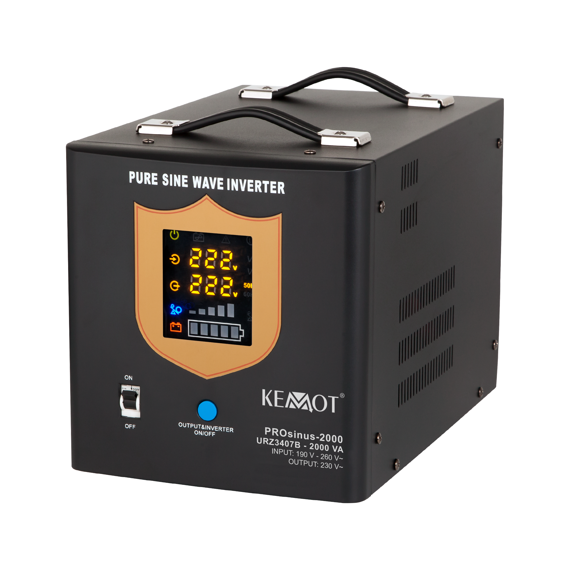 Awaryjne zasilacze KEMOT PROSinus wyposażone są w przejrzysty wyświetlacz LED, który wskaże aktualny status pracy urządzenia. Na wyświetlaczu skontrolujesz m.in. poziom napięcia wejściowego, wyjściowego i częstotliwości. Co więcej szybko sprawdzisz też poziom obciążenia i poziom naładowania baterii