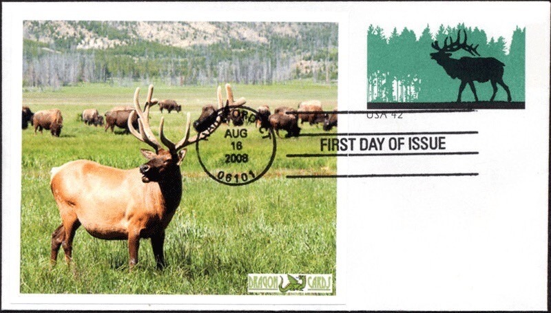 Sc. U663b Elk envelope Offset lithography version, with a Dragon Cards label cachet showing elk in the summer, tied by First Day of Issue hand cancel. Great addition for a wildlife- or animals-on-stamps collection!
