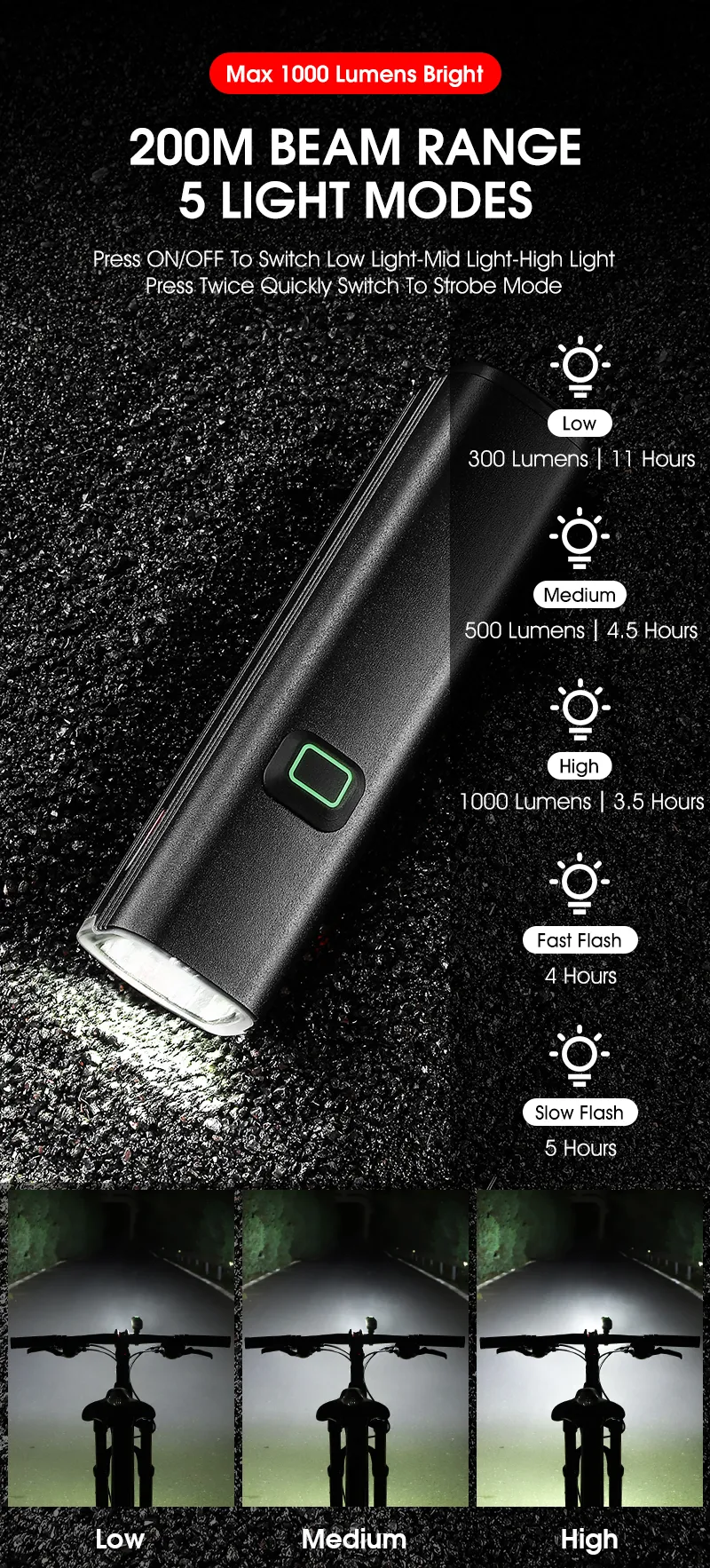 Press On/Off To Switch Low Light-Mid Light-High Light