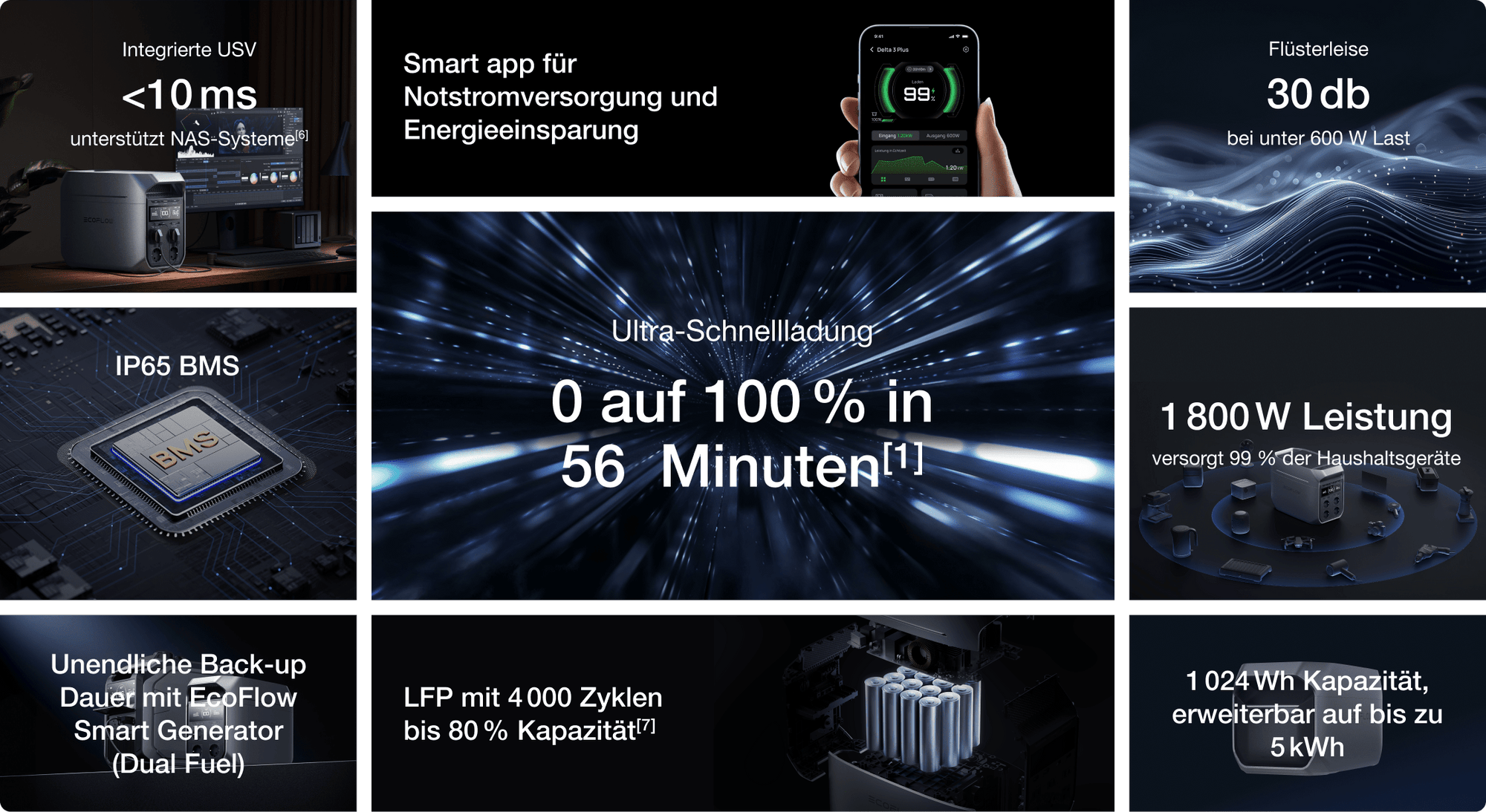 Absolut geräuscharm bei unter 600 W Last, verschmilzt mit den natürlichen Umgebungsgeräuschen (30 dB). Ob im Zelt oder zu Hause, Ihr Schlaf wird nicht gestört.
