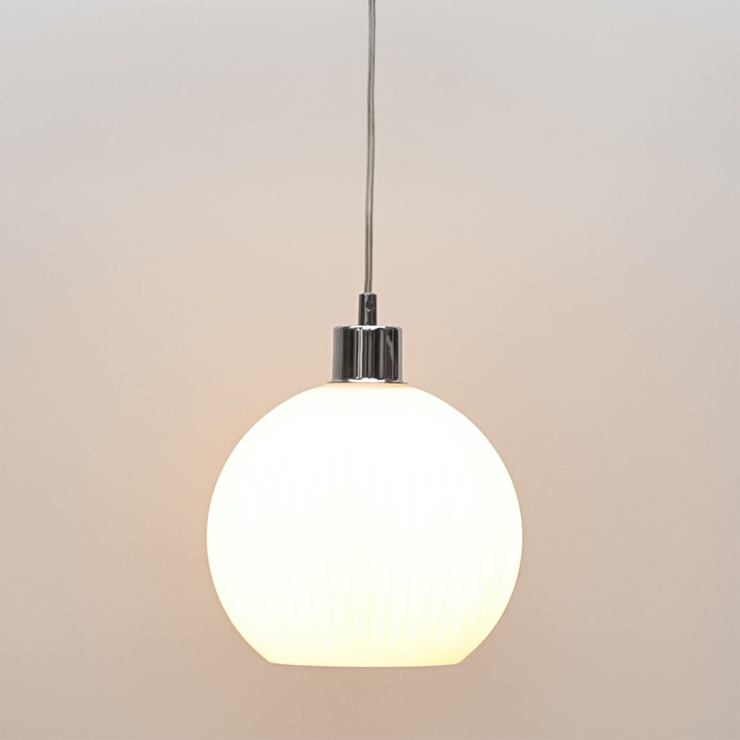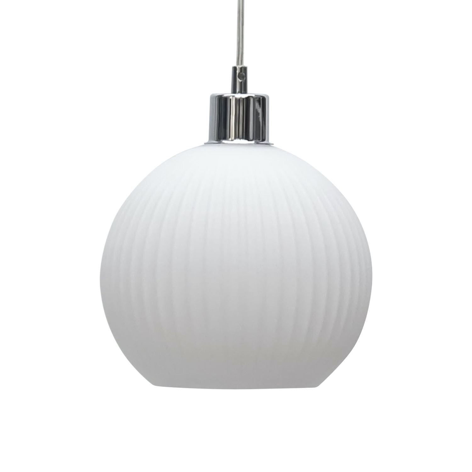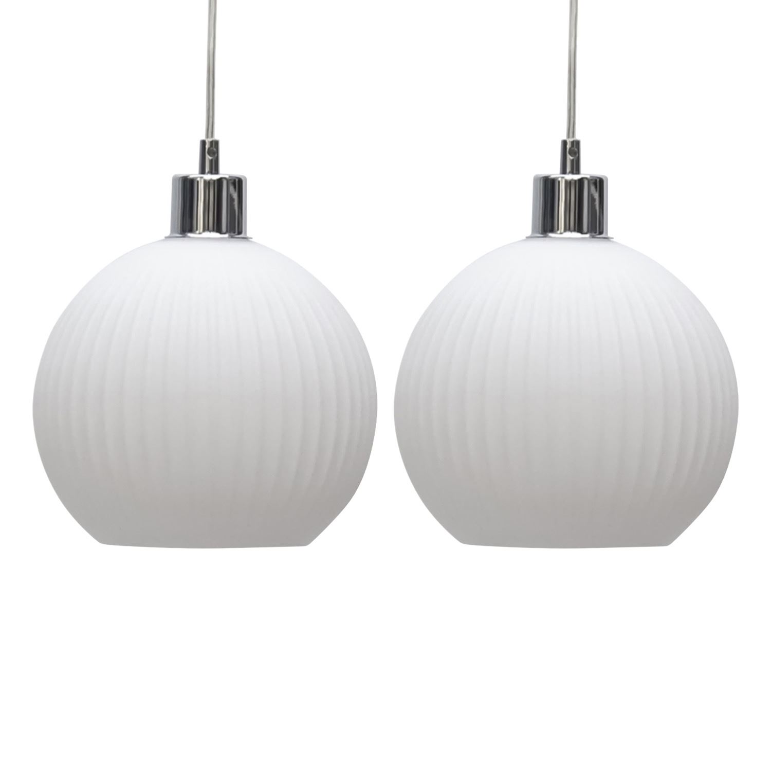 Set of 2 modern white ribbed glass globe easy fit pendant shades to modernise and brighten your living, kitchen or dining space.
