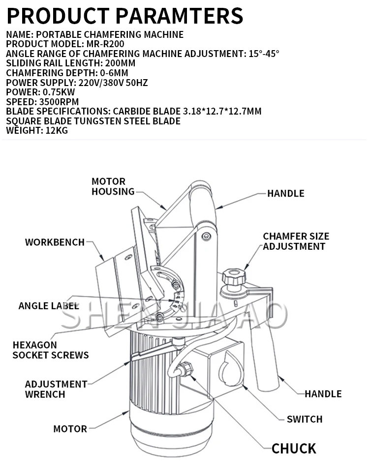 Features: *This machine is suitable for large workpieces without heat treatment, such as various molds and mechanical parts. The chamfering does not need to be clamped, the operation is simple, the chamfering is regular, the adjustment is convenient, economical and reliable, and the efficiency is 10-15 times that of CNC equipment. It is the development trend of the machinery industry. *The work surface is made of high-quality die steel after heat treatment, which is durable and has low friction. * Any length of steel, iron, copper, aluminum and other metal parts can be easily chamfered. * Place the slide rail against the workpiece during operation and cut in the direction indicated by the arrow. *Standard square-edged tungsten steel (carbide) blade 3.18*12.7*12.7 is easy to replace, and old blades used by milling machines can also be used. *The surface roughness of the chamfer is good. *It is better to keep the grinding amount of feed 2mm each time.