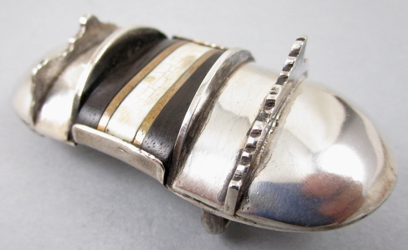 Up for sale is an amazing early belt buckle made by Dallas based artisan jeweler, Sharon Johnston. The buckle is 2 3/4” long x 1 1/4” wide and is handcrafted from sterling silver. It has brass, wood and fossilized water buffalo bone accents at the center. It is in very good condition and is marked “Ster” with the Sharon Johnston “SJ” monogram. It is 44 grams