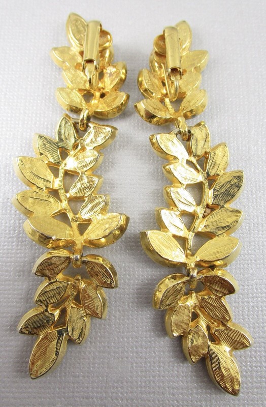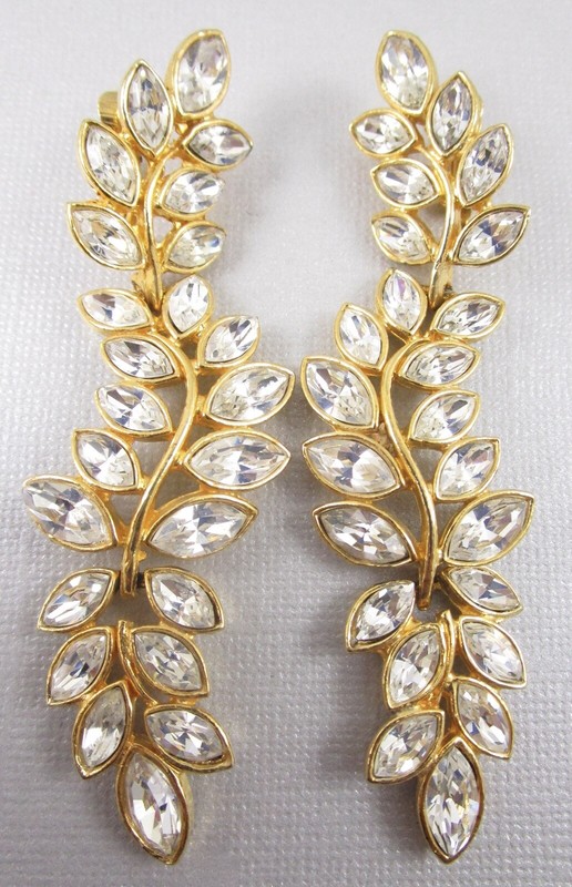 Up for sale is a fantastic pair of vintage earrings made by the legendary costume jewelry firm of Kenneth Jay Lane. Each clip style earring is 3 1/2” long x 3/4” wide and both are made from gold tone metal with clear marquis crystal rhinestones. They are in excellent condition and are marked “Kenneth Lane” on the reverse.