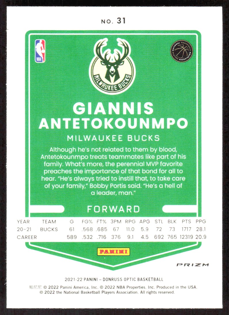 2021-22 5408E Donruss Optic PURPLE PRIZM Giannis Antetokounmpo Milwaukee Bucks