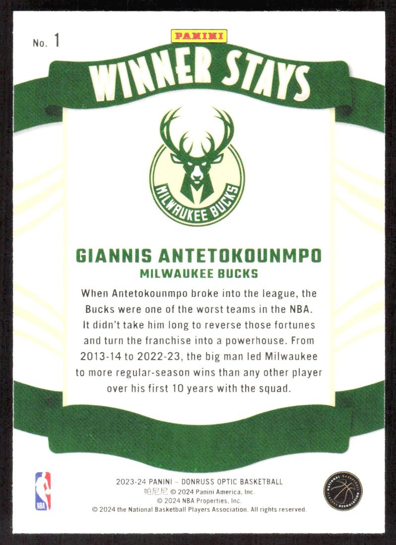 2023-24 5680E Donruss Optic Winner Stays Giannis Antetokounmpo Milwaukee Bucks