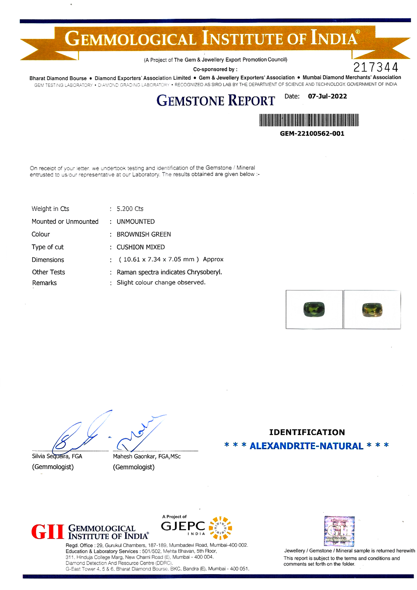 Gemmological Institute of India report # GEM-22100562-001