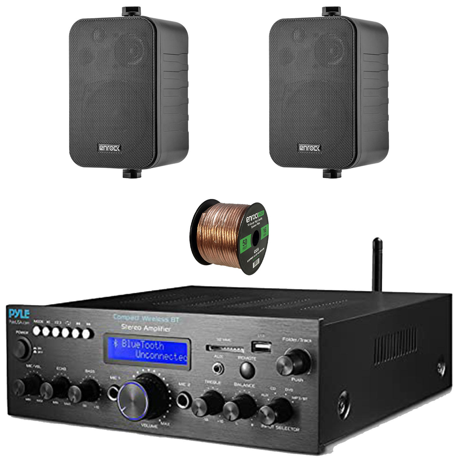 Pyle PDA612BU.5 Digital LCD Display AUX/MP3/USB/SD Bluetooth FM Radio Compact Home Audio Stereo Amplifier Receiver, 2x 4" 30W Max Power 3-Way Indoor/Outdoor Black Speakers, 50 Feet 16 Gauge Speaker Wire