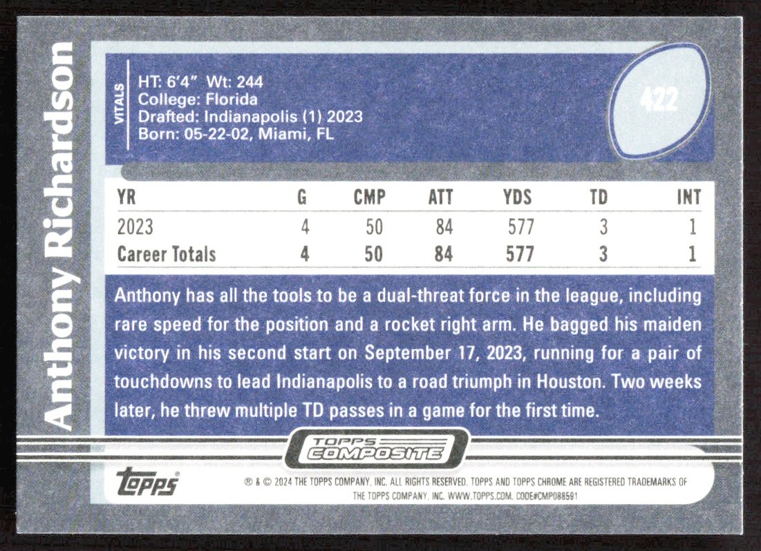2024 7094E TOPPS COMPOSITE Anthony Richardson Rookie Indianapolis Colts #422