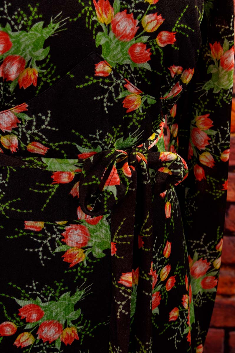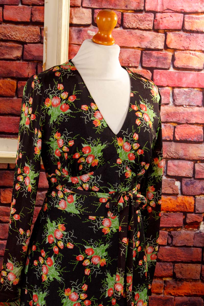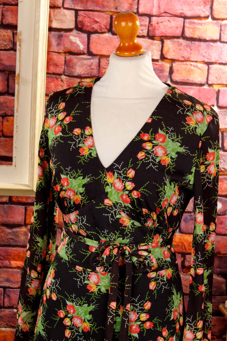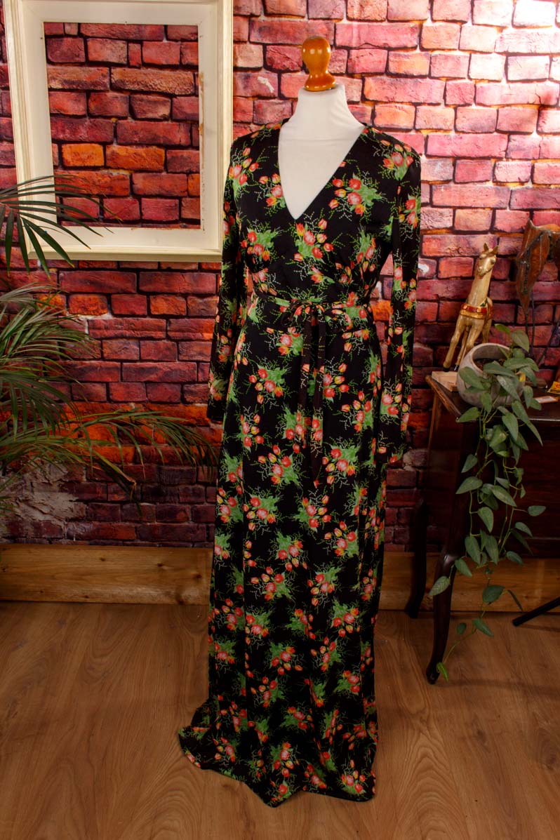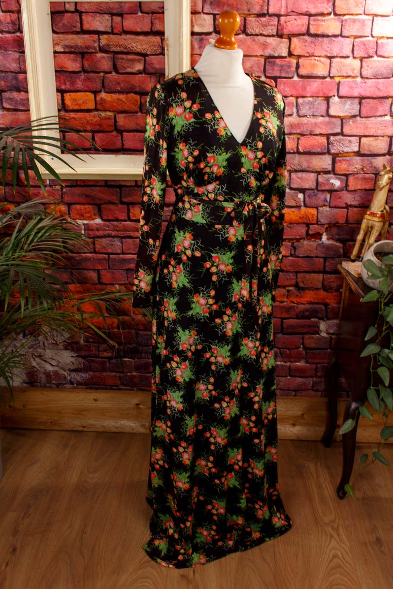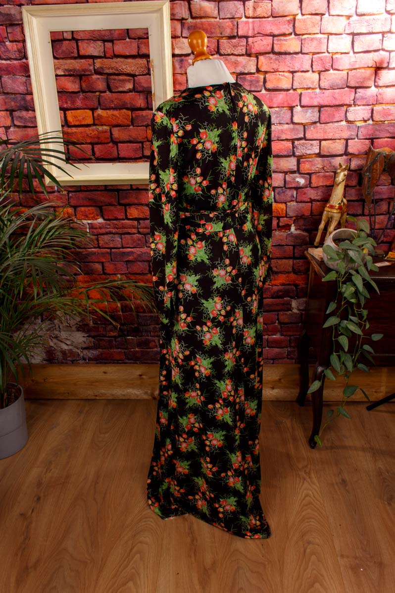 langes Kleid aus schwarzem, feinem Stretchstoff mit buntem Blumenmuster