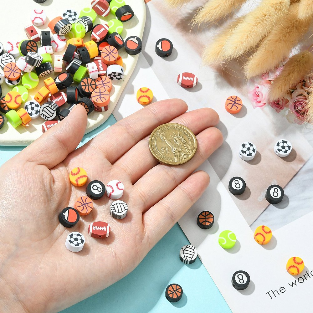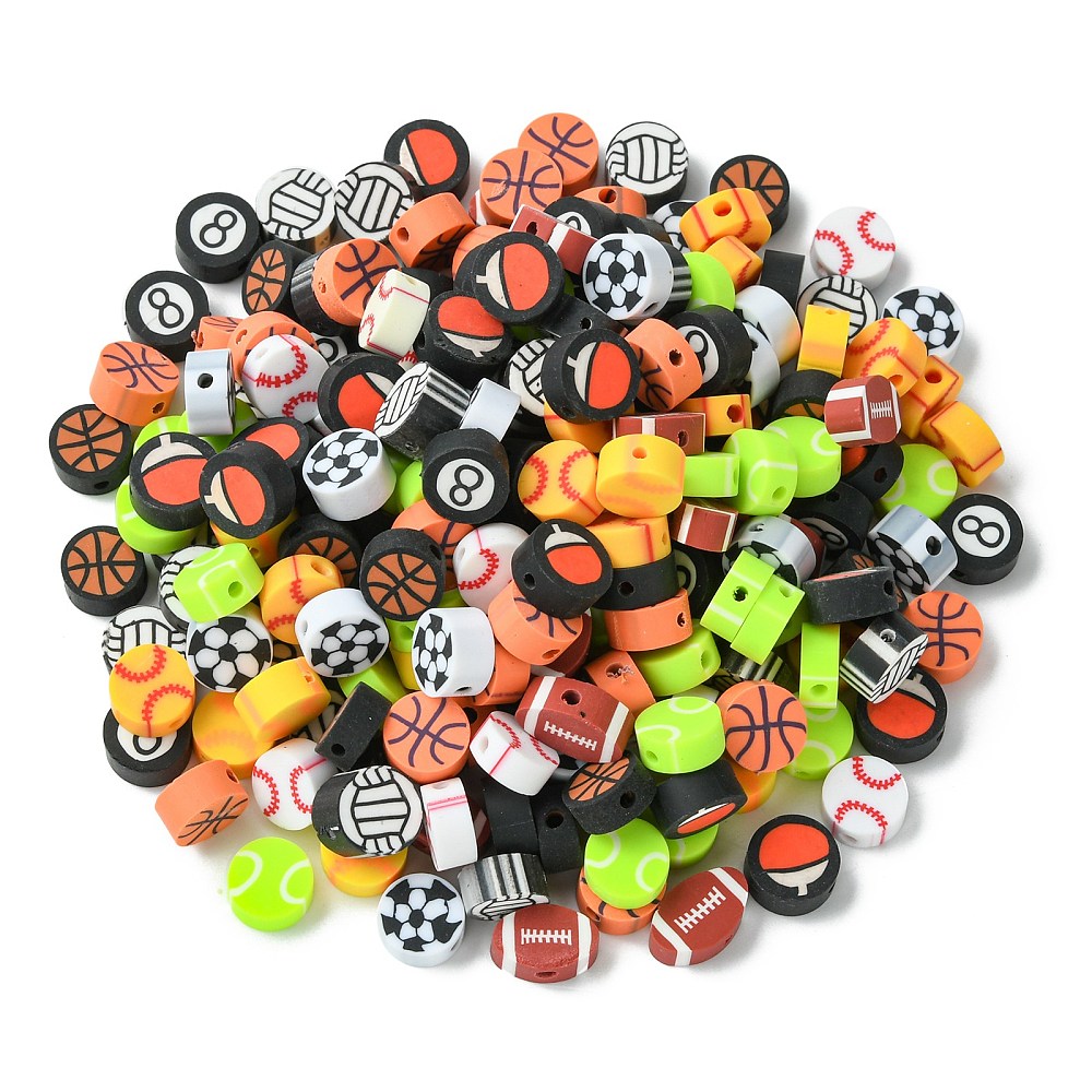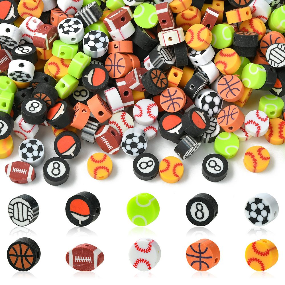 200Pcs Handmade Polymer Clay Beads, Sports Style, Flat Round, Mixed Color