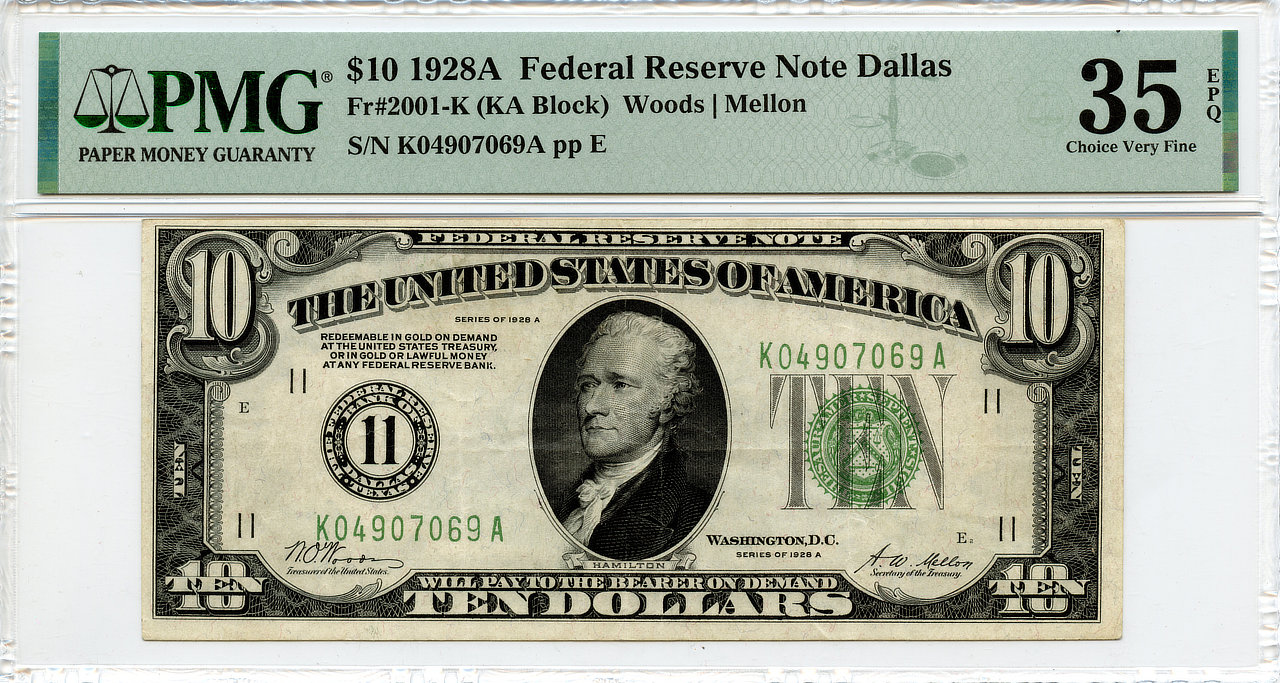 1928A $10 Dallas, Texas Federal Reserve Note Woods & Mellon S/N K04907069A pp E Fr#2001-K PMG Choice Very Fine 35 Exceptional Paper Quality.