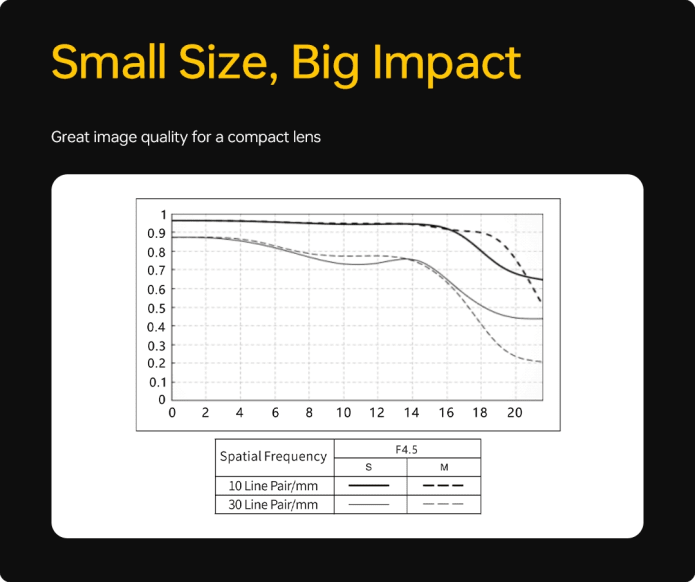 Impressive sharpness and performance from center to edge, ensuring stunning visual clarity at F4.5, no matter the scene.