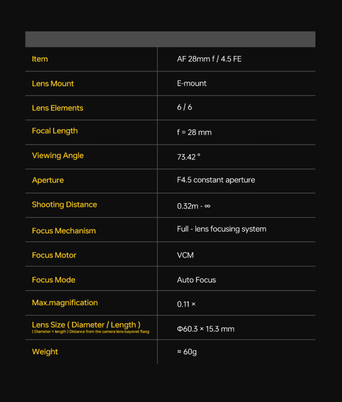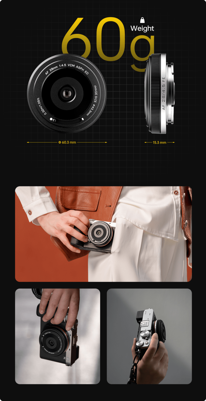 Are you a budding photographer, ready to take on the streets, landscapes, or portraits but tired of bulky, complicated equipment? Meet "Chip," the ultra-light, ultra-thin lens designed for creative freedom wherever you go. Whether you're capturing spontaneous street scenes or breathtaking landscapes, the Viltrox AF 28mm F4.5 brings professional image quality just within your pocket.