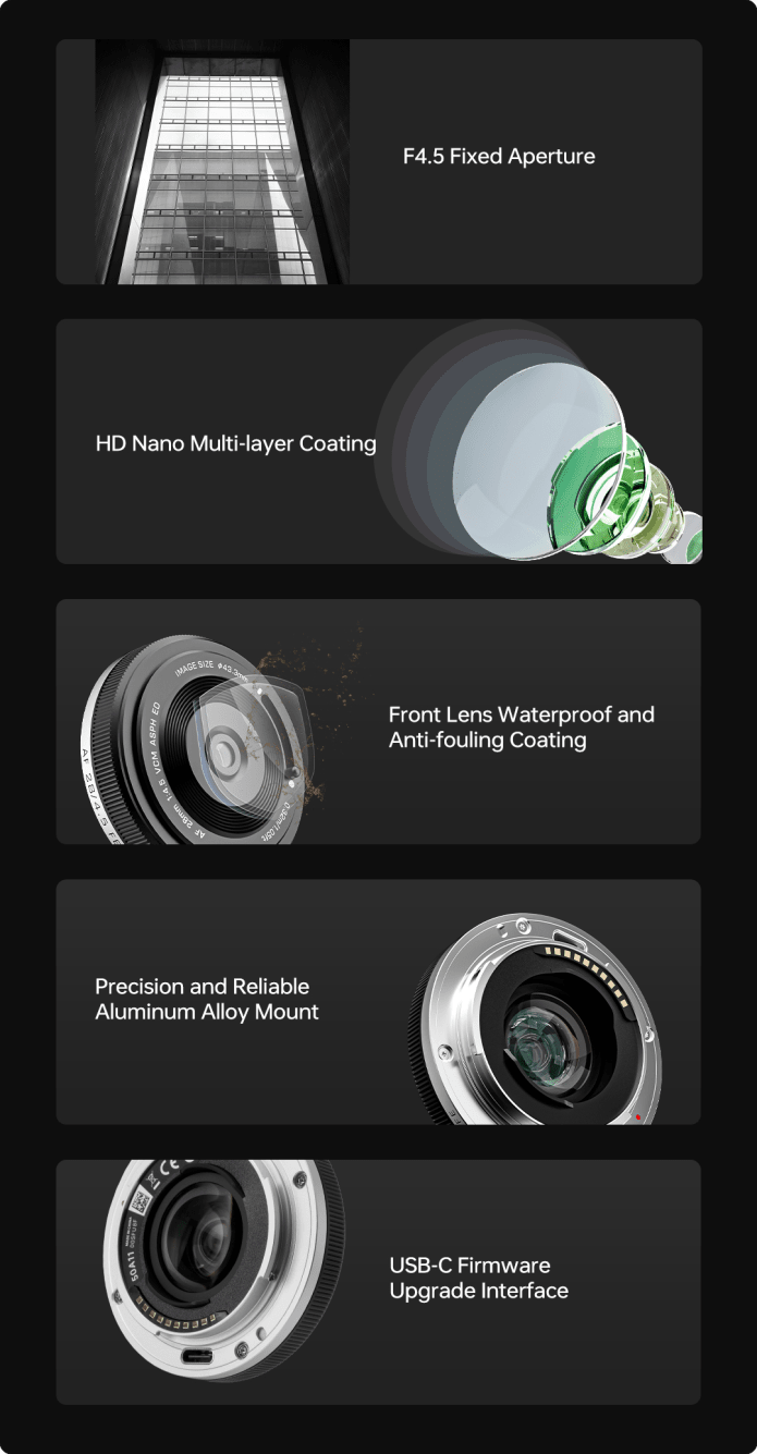 This lens may be compact, but it’s designed for full-frame cameras. Whether you’re shooting portraits with depth or wide-angle street scenes, it delivers impressive image quality and dynamic compositions, all in a mini size.