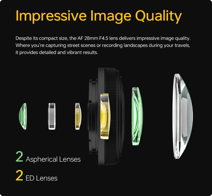 Don’t let its size fool you – the AF 28mm F4.5 delivers sharp, vibrant images with 6 elements in 6 groups, including 2 ED lenses and 2 aspherical lenses. Whether you're out for a casual photo walk or traveling to capture the world’s beauty, this lens has got you covered.