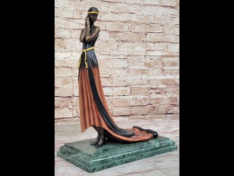 In a captivating moment of indulgence, she closes her eyes, relishing the spotlight's embrace. The meticulous artistry of the handmade bronze sculpture is evident in every detail, from the intricate folds of the dress to the expressive contours of her face and form. Crafted through the esteemed "Lost Wax Method," this sculpture stands as a testament to both tradition and innovation. Mounted on a marble base, it bears the signature of the esteemed artist Julius Erte, a mark of authenticity and quality.