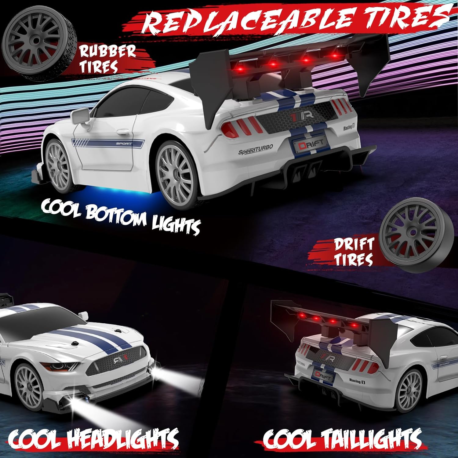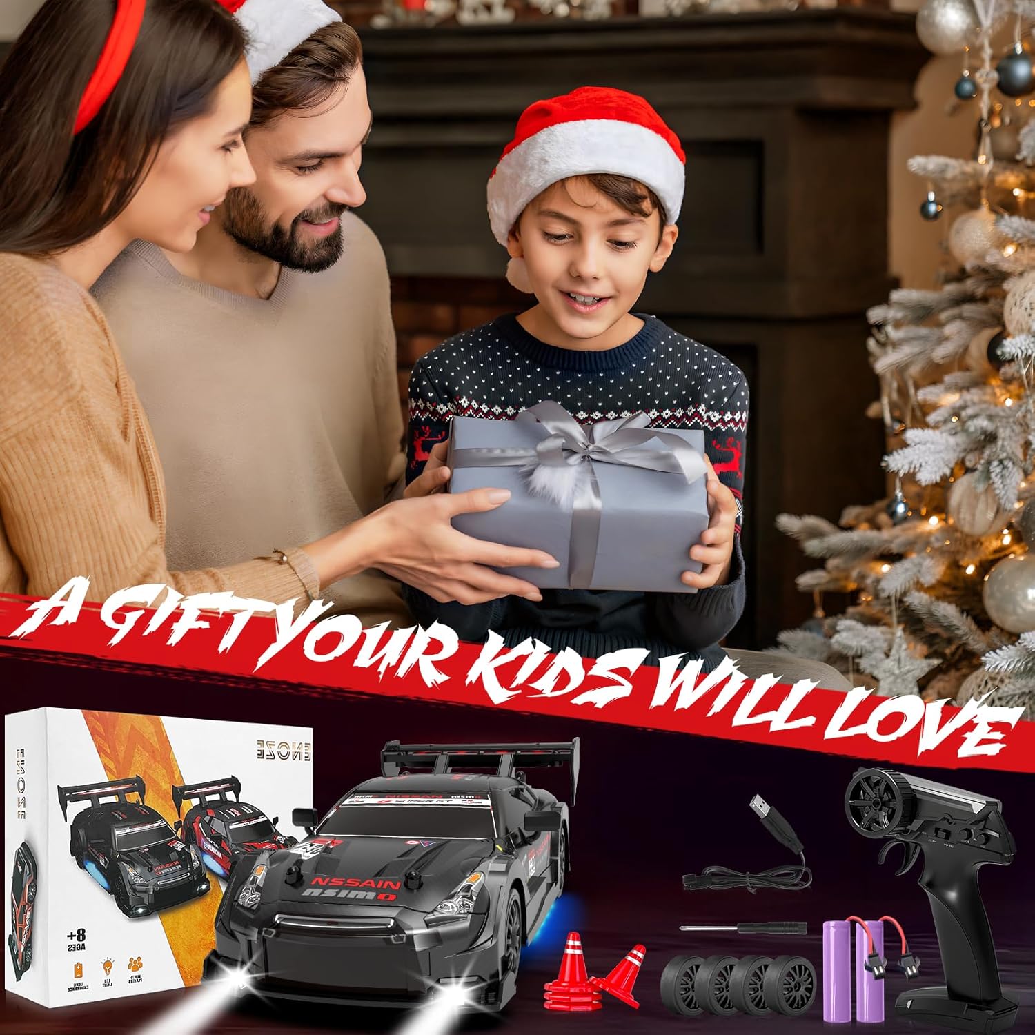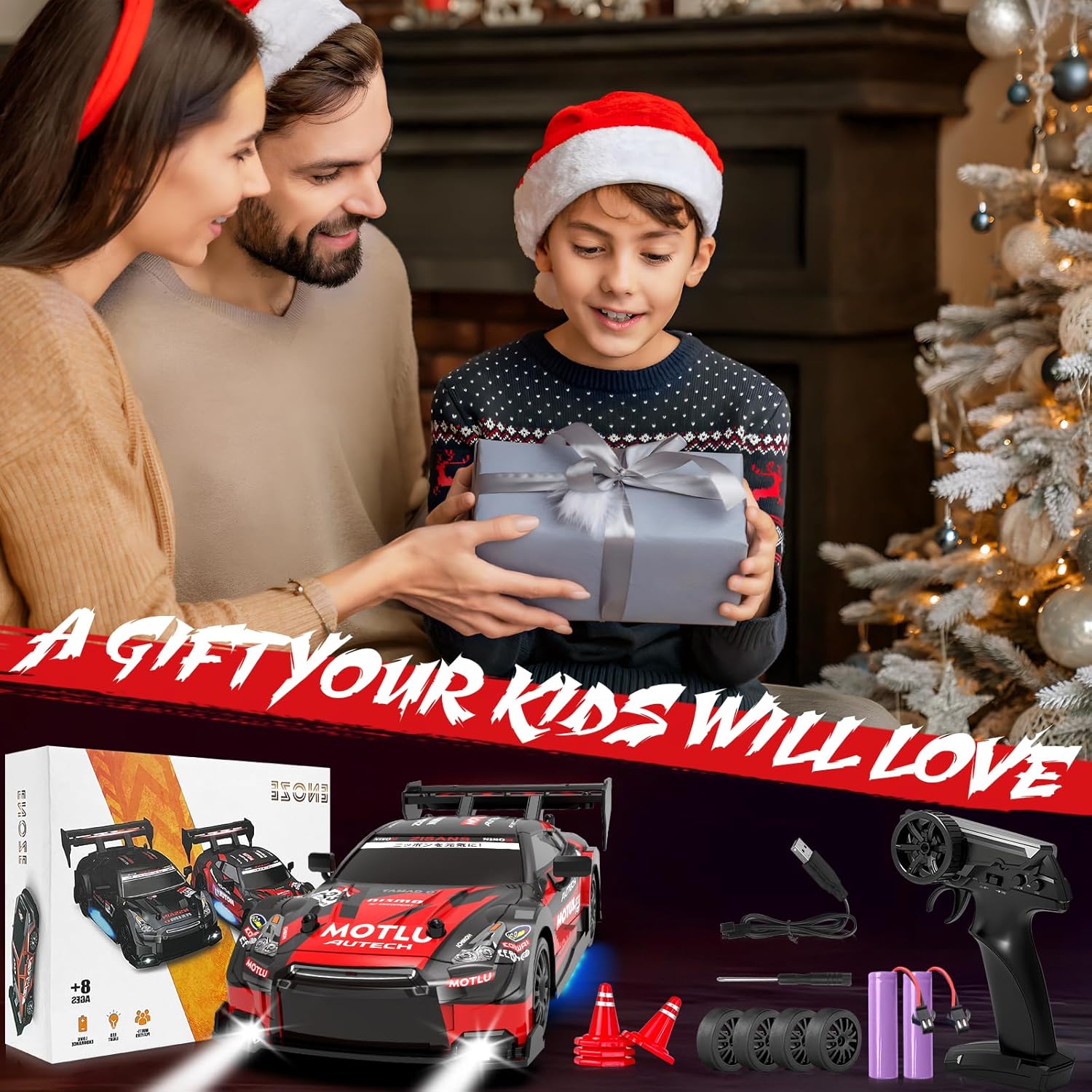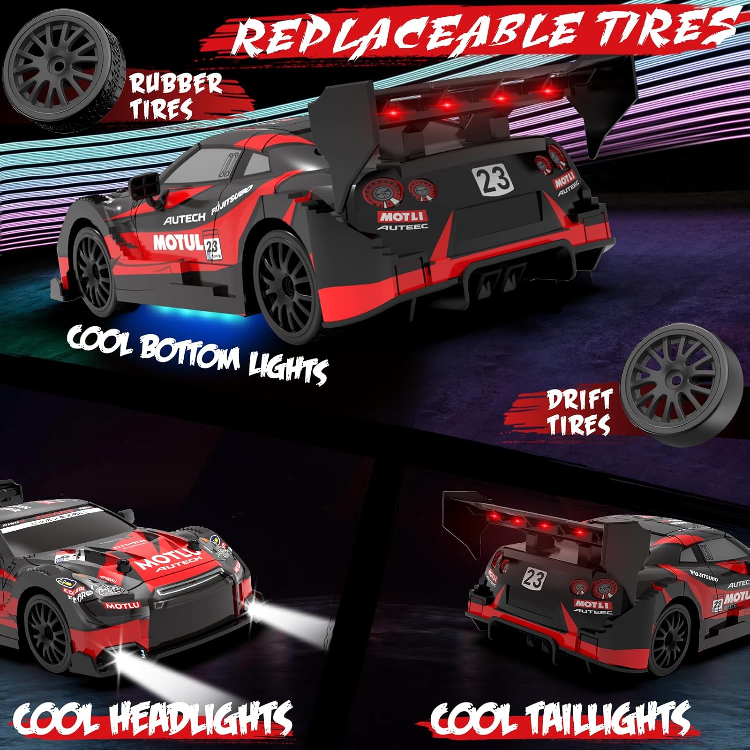 Remote control drift car has a beautiful and exquisite appearance, and the front, rear and bottom of the car are all equipped with cool lights, which makes it unique when driving in the dark! You can also use the remote control to control all the lights according to your preferences. Whether you are a drift car enthusiast, a professional drift racer, or a collector who likes to collect cars, this is a rc drift car worth choosing, which can bring you endless fun and excitement! 1:24 2.4GHz throttle ratio control 4WD drive, which is a high-performance and cool remote control drift car. Drift cars has a speed of up to 15+KM/H, which is suitable for adults, children, boys and girls. It is one of the preferred gifts for parties, birthdays, Valentine's Day, Halloween, Children's Day, Christmas, and rewards, and it is also an ideal toy.