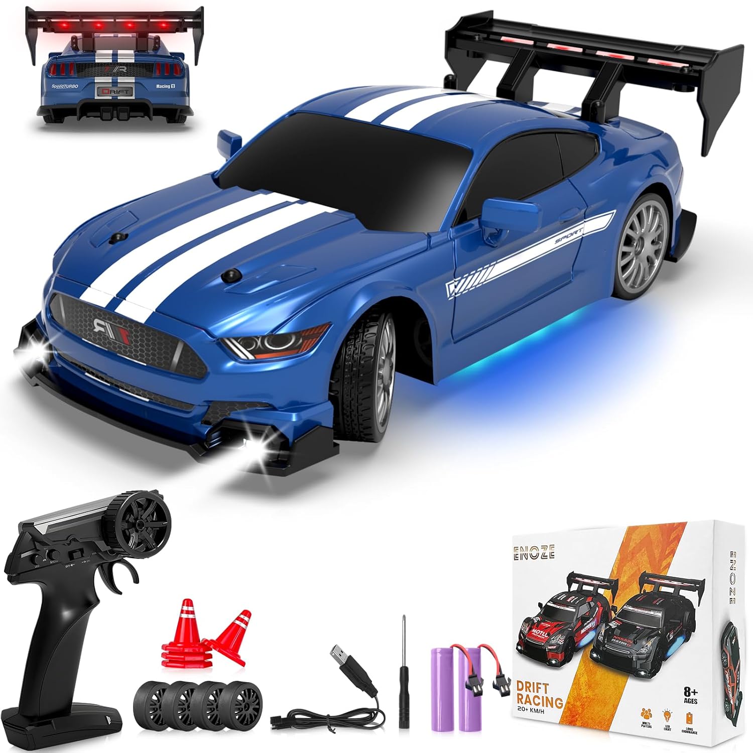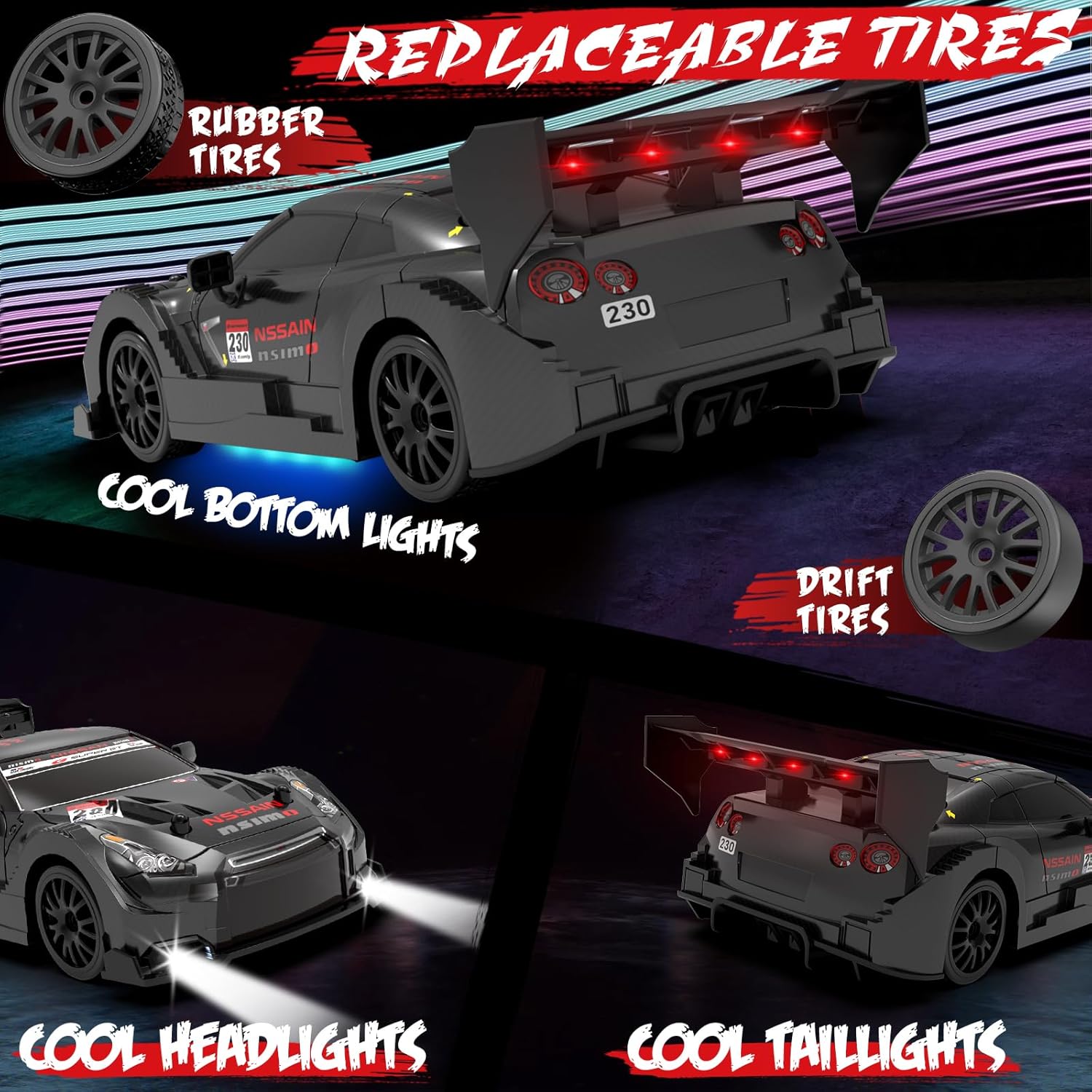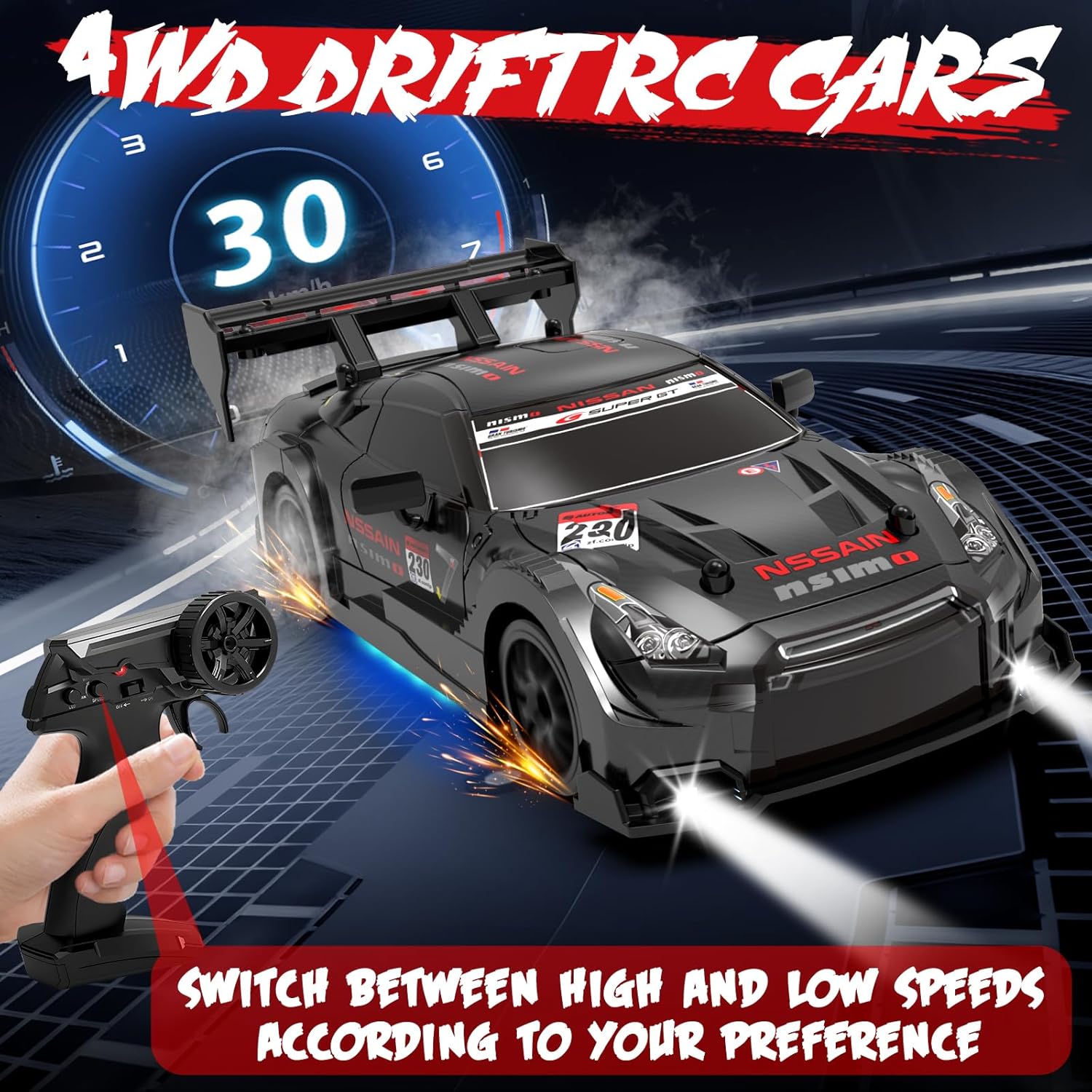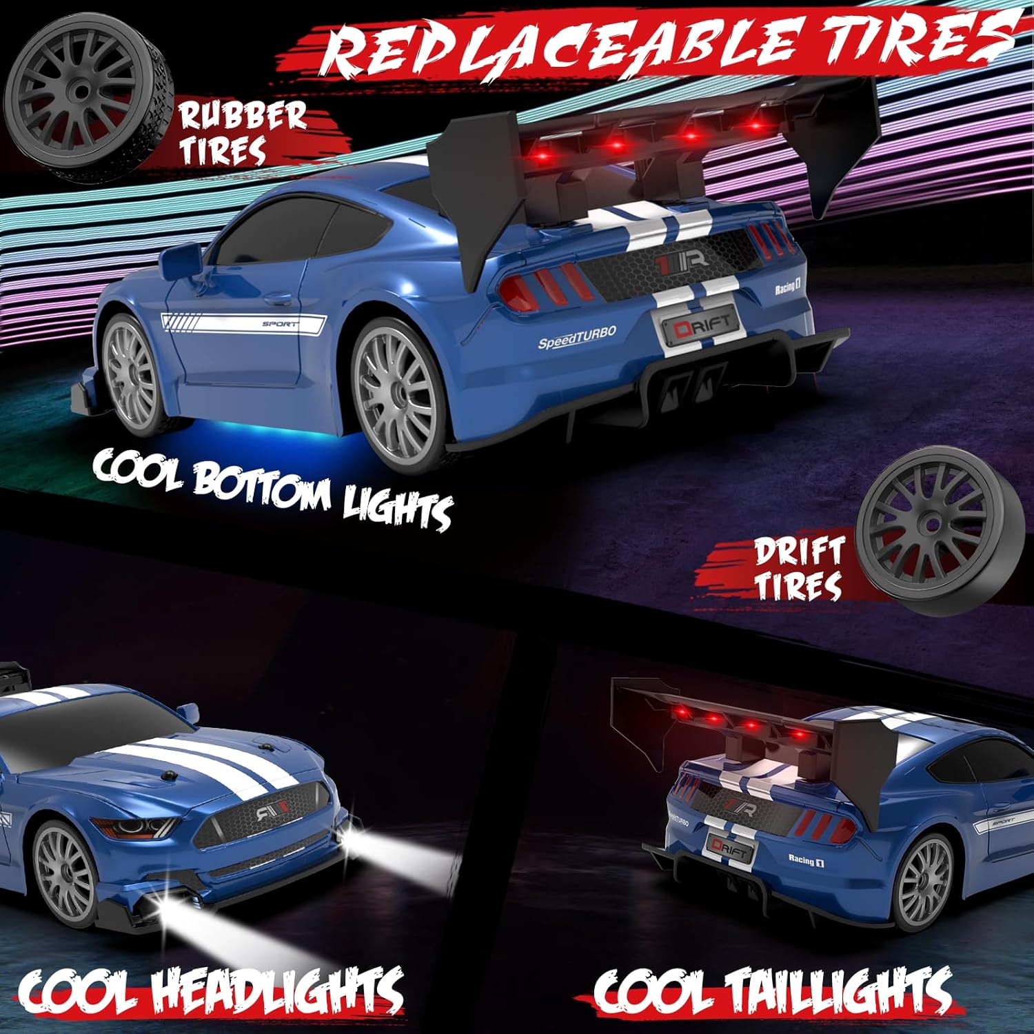 Remote control drift car has a beautiful and exquisite appearance, and the front, rear and bottom of the car are all equipped with cool lights, which makes it unique when driving in the dark! You can also use the remote control to control all the lights according to your preferences. Whether you are a drift car enthusiast, a professional drift racer, or a collector who likes to collect cars, this is a rc drift car worth choosing, which can bring you endless fun and excitement! 1:24 2.4GHz throttle ratio control 4WD drive, which is a high-performance and cool remote control drift car. Drift cars has a speed of up to 15+KM/H, which is suitable for adults, children, boys and girls. It is one of the preferred gifts for parties, birthdays, Valentine's Day, Halloween, Children's Day, Christmas, and rewards, and it is also an ideal toy.