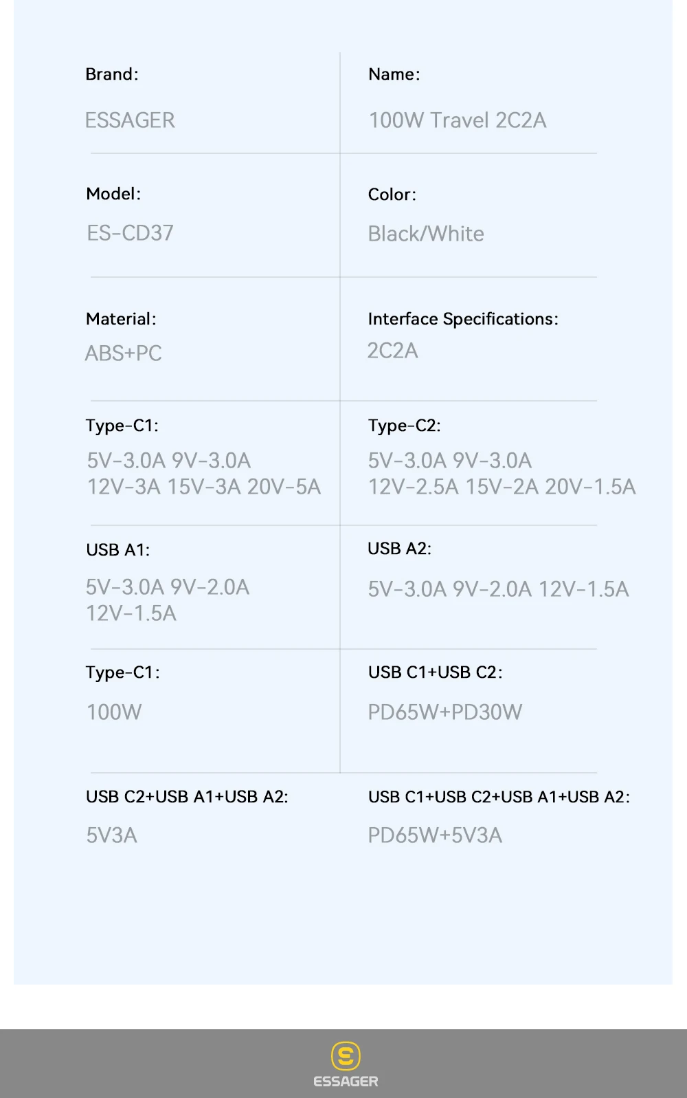 OutputType-C1: 5V⎓3A 9V⎓3A 12V⎓3A 15V⎓3A 20V⎓5A(100W)