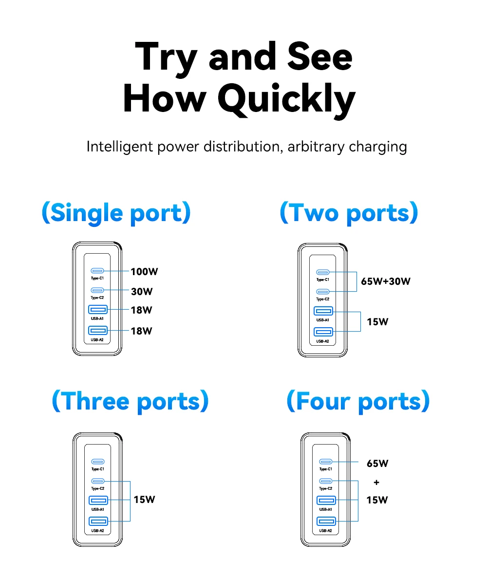 Feature 1:100W2C2A four port combination, suitable for simultaneous charging of multiple devices (laptops, tablets, phones, headphones).