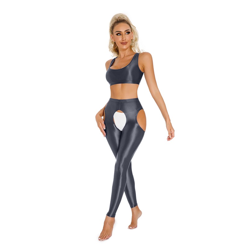 Crop vest designs with U neck, wide shoulder straps, pullover, matches with high waist leggings having open crotch and thigh cut out.