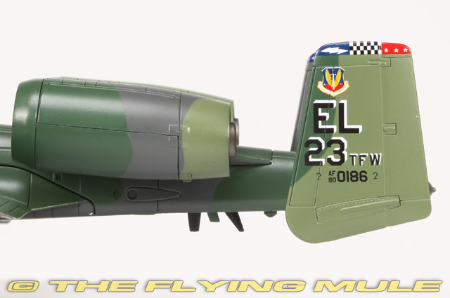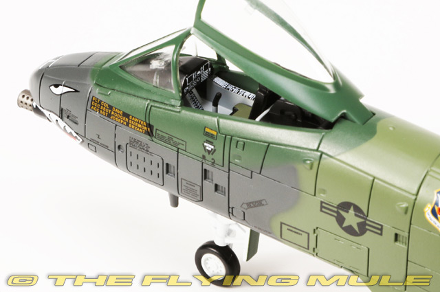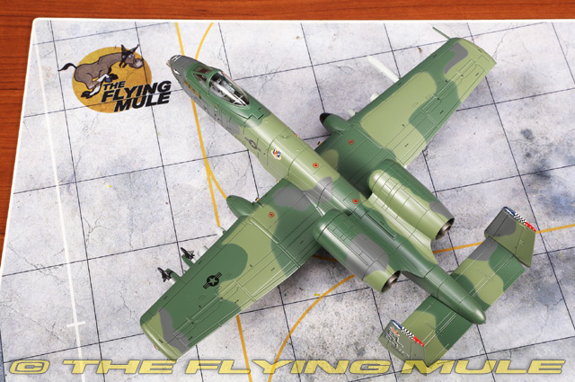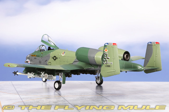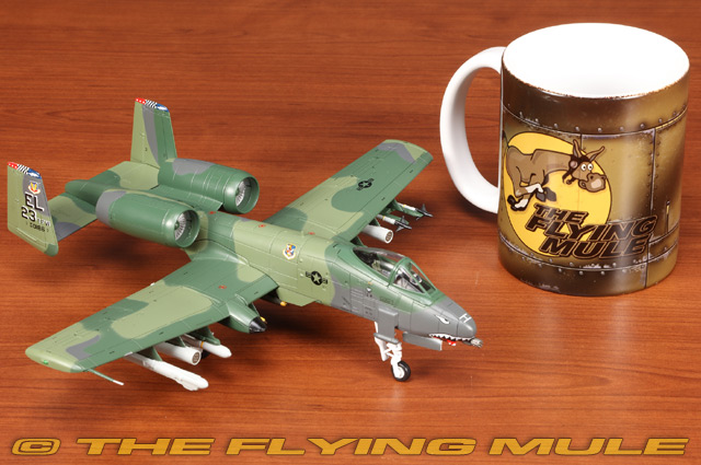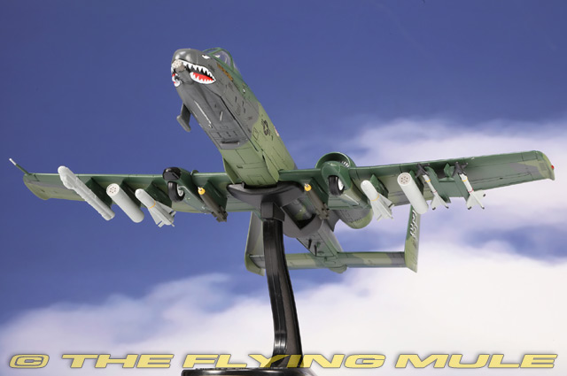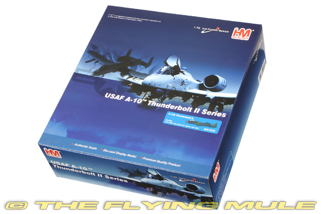 On February 15th, 1991, Pilot Col. David A. Sawyer was leading a two-ship formation to attack the south edge of the Medina Division. They first dropped CBU-58s on soft targets. Col. Sawyer then identified armor in revetments and attacked with an AGM-65 Maverick missile. When pulling off target, he saw three people running towards more vehicles. Col. Sawyer then strafed the targets and as he was pulling off he felt the impact of a missile. The tail control surfaces of the aircraft sustained major damage but Col. Sawyer managed to nurse the aircraft back to King Fahd Airport, Saudi Arabia for a safe landing. His aircraft had 384 holes in the airframe but it was repaired, using a fin from another A-10 and returned to flying status within 7 days. Fairchild A-10A Thunderbolt IIDesigned to counter criticism that the US Air Force wasn't serious enough about close air support, the A-10 Thunderbolt II was first flown on May 10, 1972. The Thunderbolt II is a single-seat attack aircraft used to protect ground forces from tanks, armored vehicles and other ground targets. Nicknamed "Warthog," the A-10 is highly maneuverable at low speeds and low altitude and is capable of short take-offs and landings. It is designed for easy maintenance-many of its parts are interchangeable between the right and left side and it can operate from bases with limited facilities. The A-10 is expected to remain in service until 2028 or beyond.© Copyright 2003-2025 The Flying Mule, Inc. Hobby Master's 1:72 scale A-10 Thunderbolt II has crisp panel lines and a high-quality finish. The hinged canopy opens to expose beautifully recreated front and side instrument panels, control stick and seat. Other fine details include a slightly offset 30 mm gatling-gun barrel with cooling vents, a Pave Penny pod below the cockpit, several ventral mounted antenna and prominent high fuselage-mounted engine nacelles that provide an unobstructed view of the turbo fan's blades. The solid metal wing features cambered control surfaces and main gear nacelles, and a complete set of removable under-wing mounted ordnance has been included for multiple configuration options. © Copyright 2003-2025 The Flying Mule, Inc. Hobby Master 1:72 Air Power SeriesThe Hobby Master "1:72 Air Power Series" range presents detailed, ready-made diecast models of military aircraft.Hobby Master "1:72 Air Power Series" diecast airplanes feature: