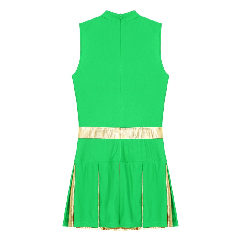 Designed with mock neck, sleeveless, metallic fabric patchwork, letter print, pleated A-line skirt and integrated safety briefs, back hidden zipper.