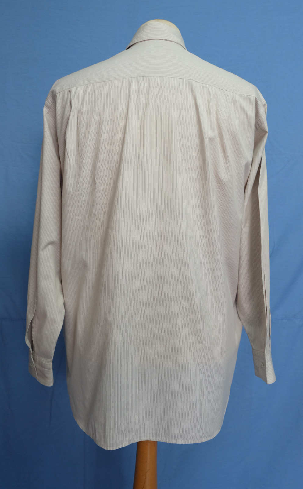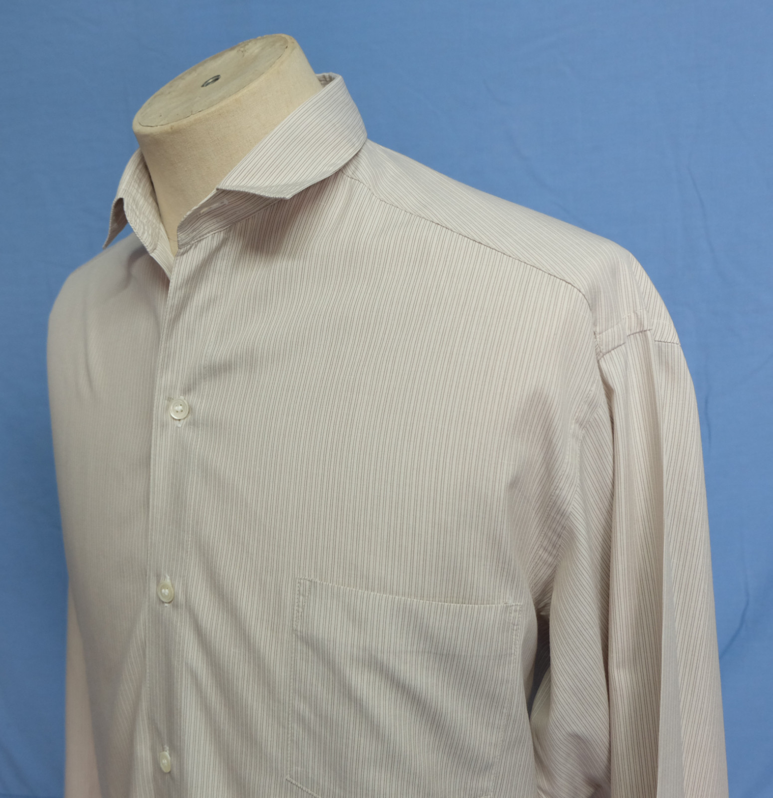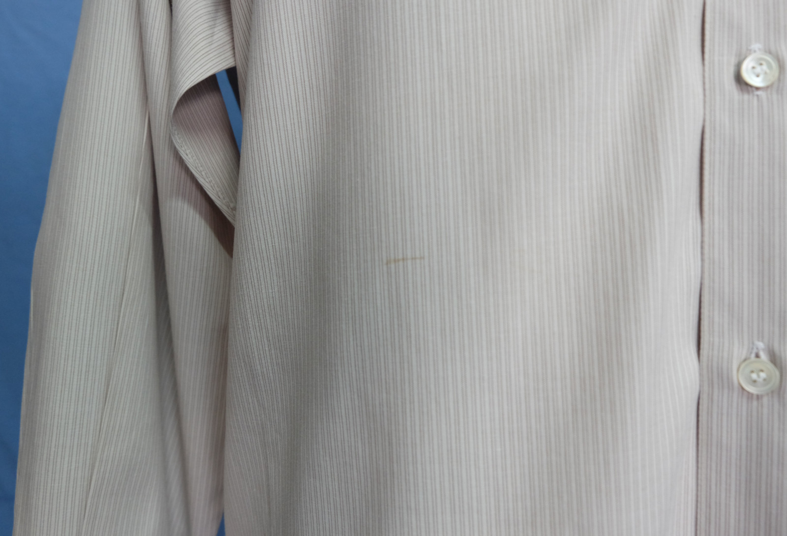 Awesome COMME des GARCONS HOMME striped men's shirt authenticity guaranteed. Check out gorgeous designer shirt long sleeves with buttons down. The shirt has point collar, single chest pocket on left with 6 mother of pearl buttons closure on front. The color is cream with light brown striped. Fabric is 100% cotton. The shirt is pre-owned still in good condition, there are tiny stains at the left sleeve and right waist of the shirt. Please see the photos. It has been laundered clean and fresh ready to wear. Don't miss out cool and awesome shirt.