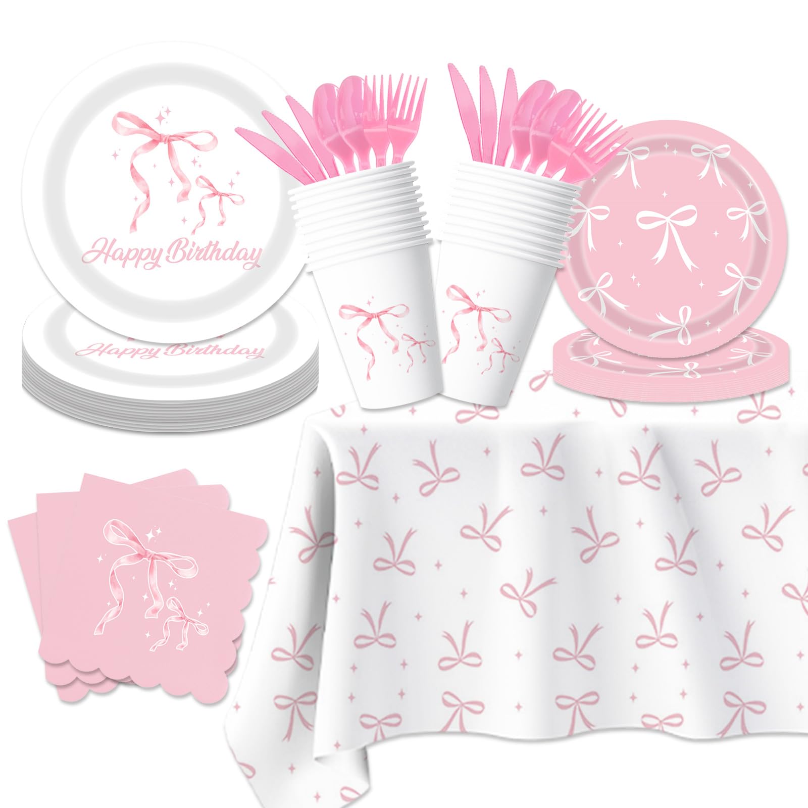 Pink Bow Birthday Party Supplies, Coquette Birthday Decorations Pink Bow Party Plates Napkins Cups Cutlery Tablecloth,Pink Birthday Decor for Girl Bachelorette Bridal Engagement Baby Shower, Serves 24