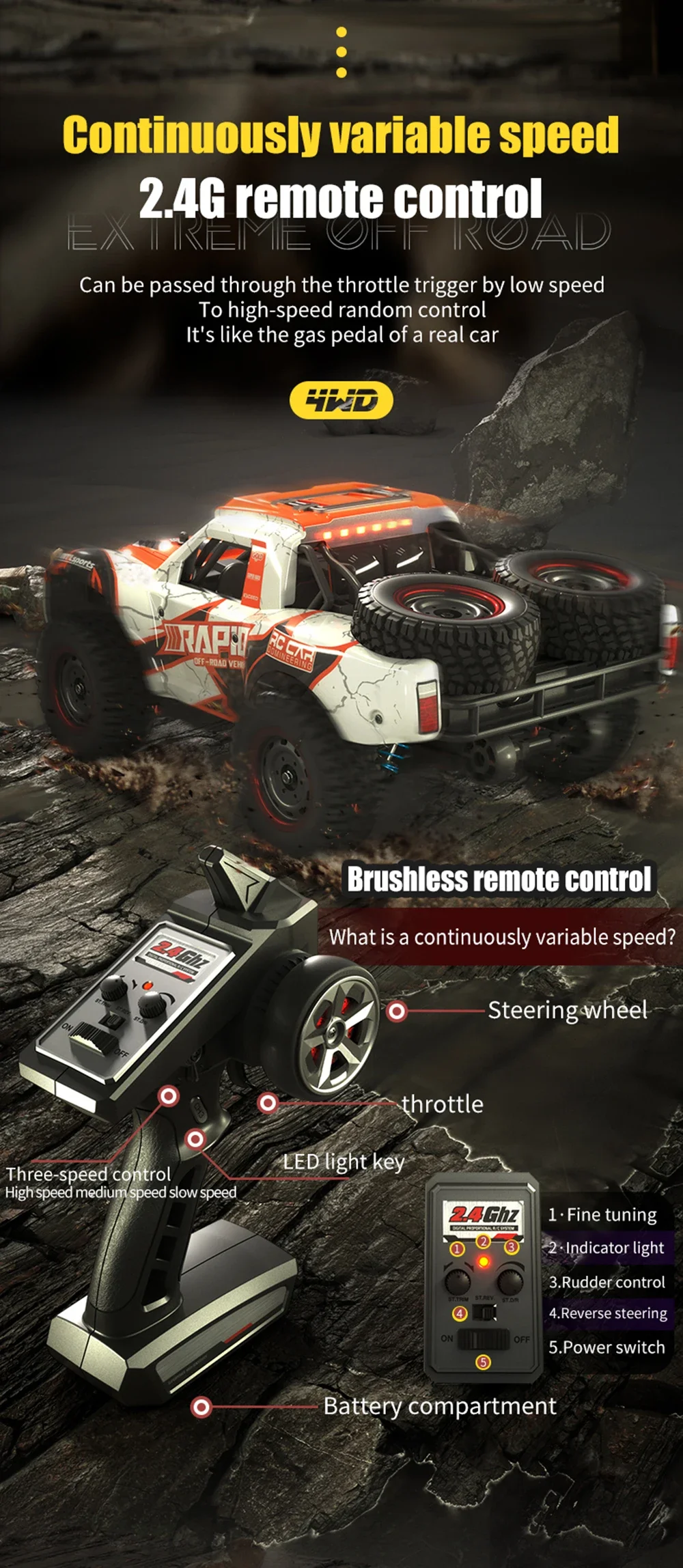 1. Adopt simulation structure design, have the real car control feeling, realize full scale stepless speed change, high speed, rapid acceleration, deceleration, braking, reversing, left turn, right turn.