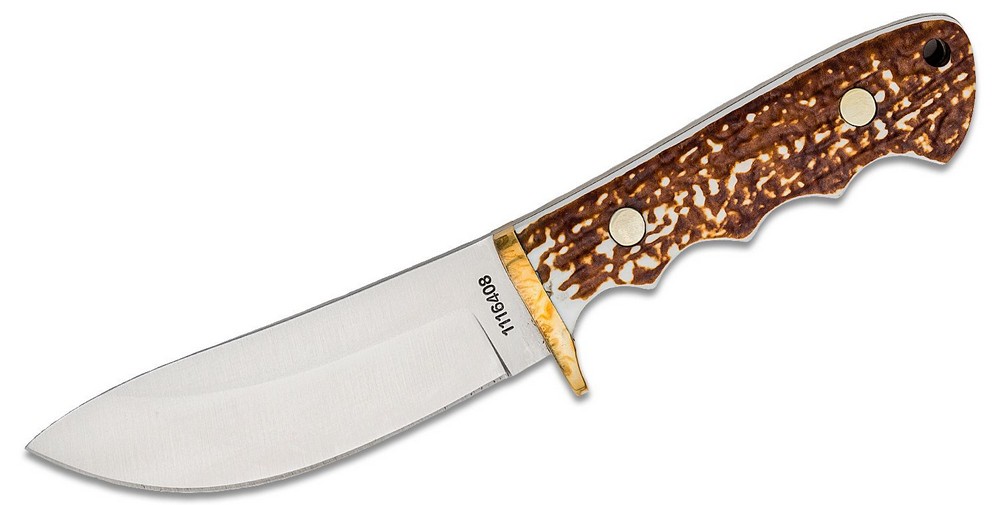 8.5" overall. 3.88" satin finish 7Cr17MoV stainless blade. Finger grooved Staglon handle. Brass guard. Lanyard hole. Full tang. Brown leather belt sheath. Boxed.