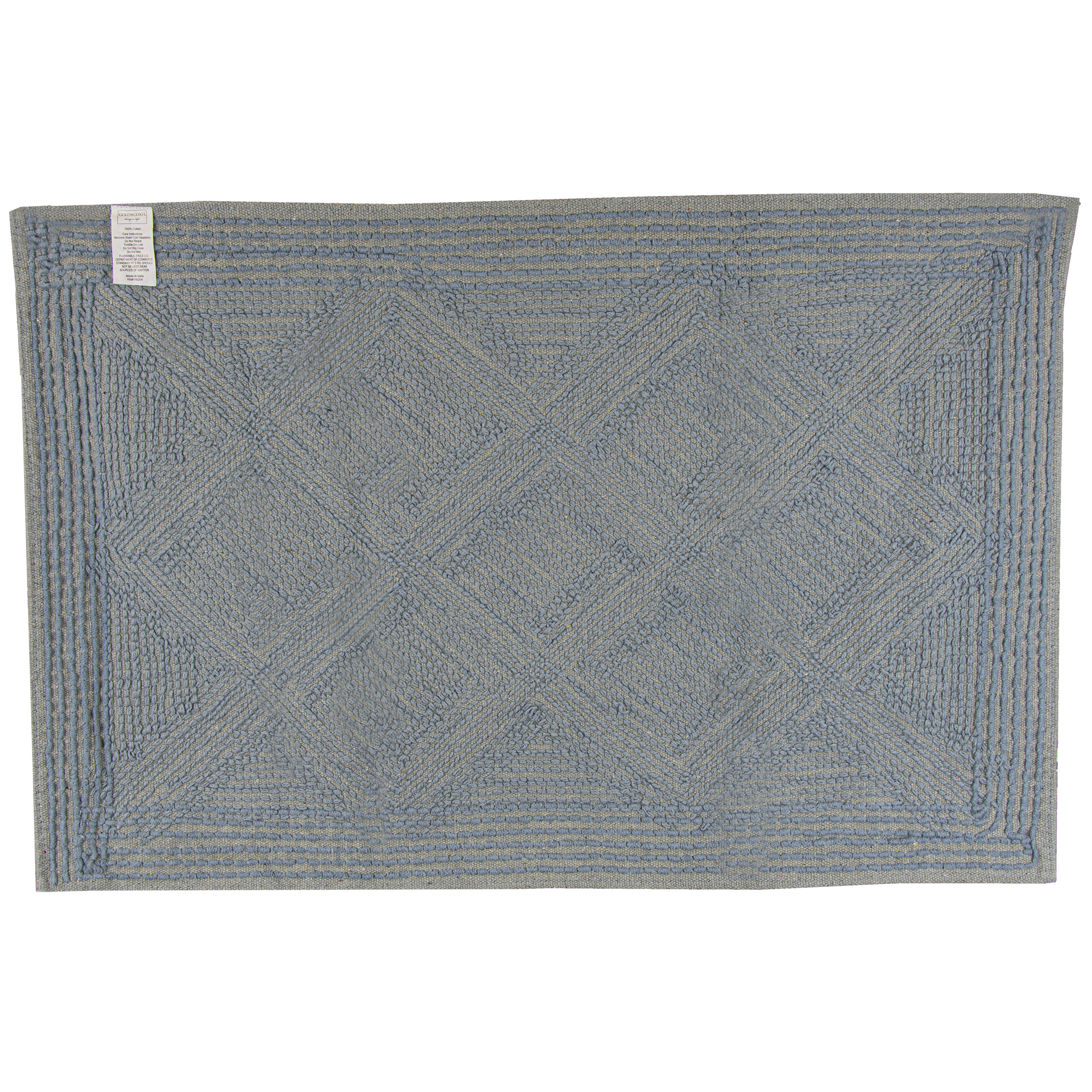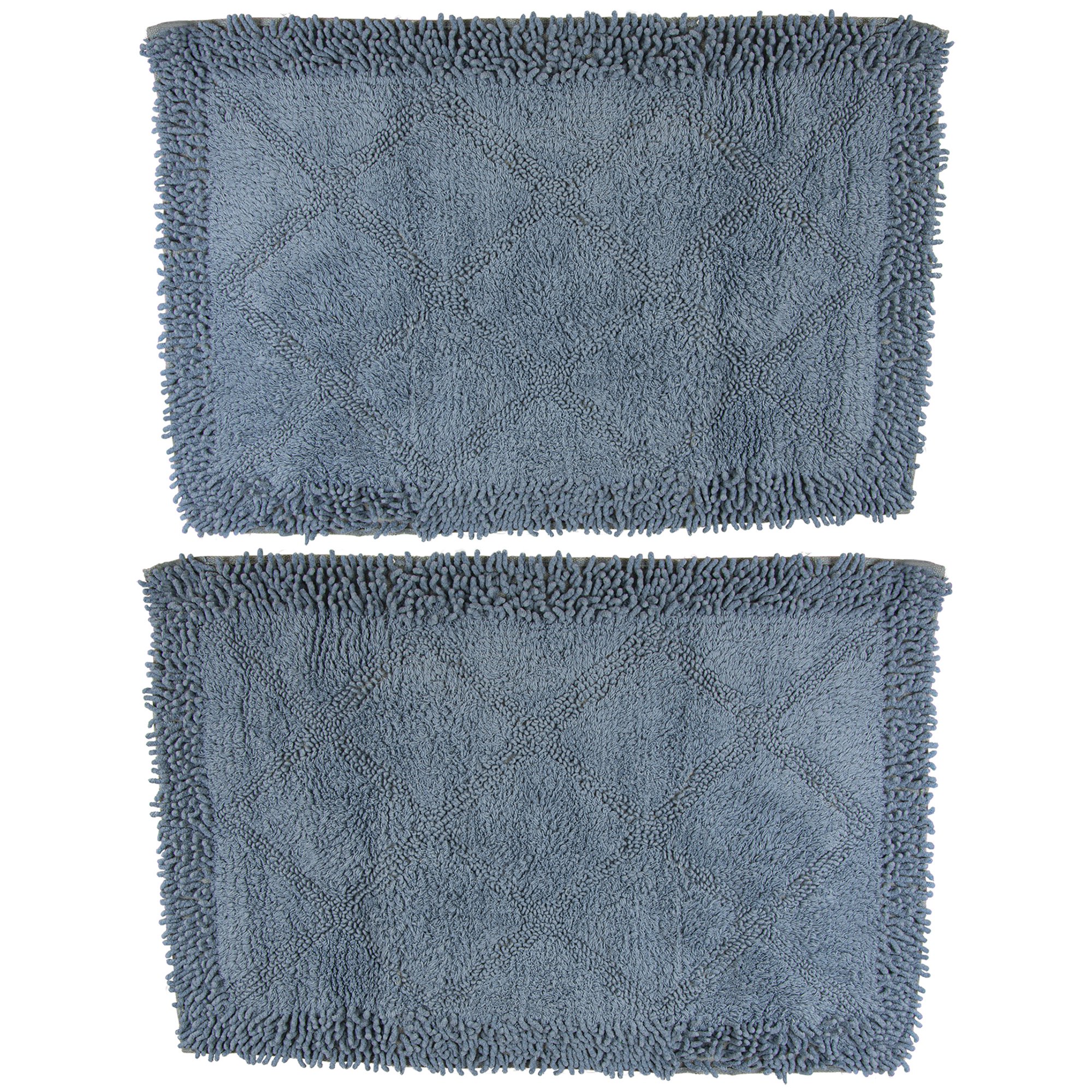 A luxurious shaggy, plush landing for your bare feet and this decadent cotton rug adds charm to any bathroom. Perfect for use near the sink, shower or bathtub. It feels soft on your feet and is designed to absorb water, keeping your bathroom floors dry and clean. This set includes two rectangle shaped rugs in blue with a lattice pattern. The rugs are made of 100% cotton and are machine washable and dryable. Dimensions: 28" L x 18" W.