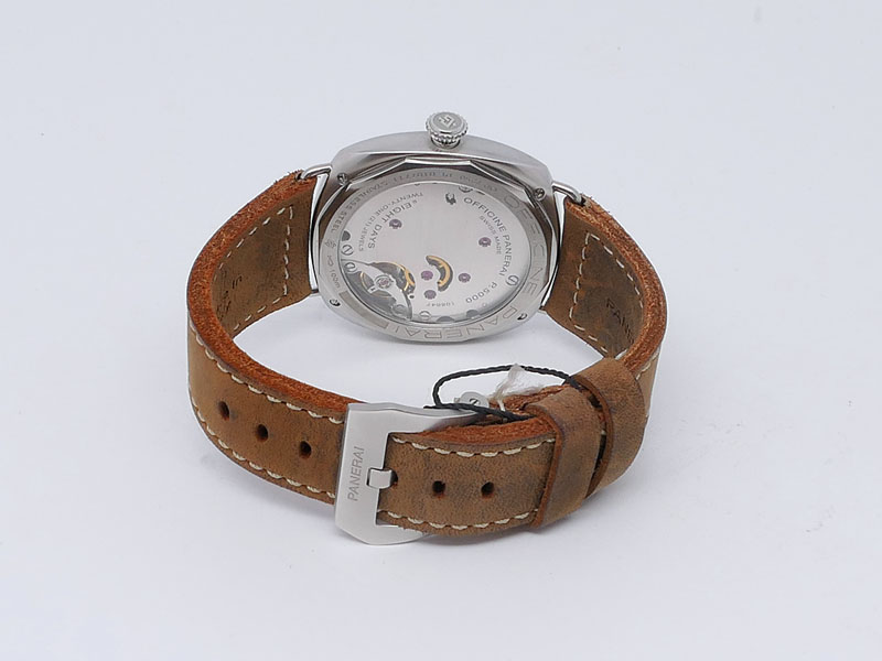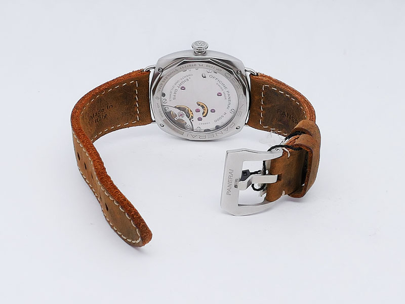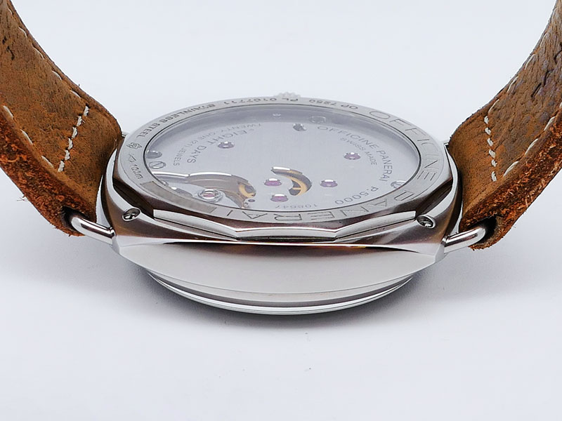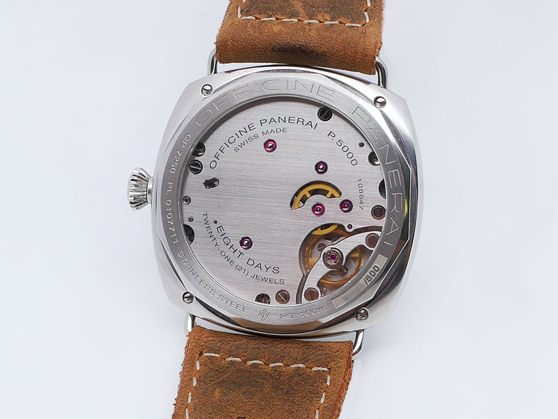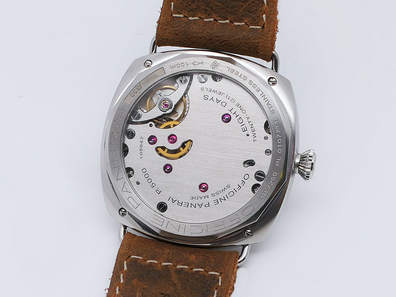 Panerai caliber P.5000, features a robust, hand-wound, eight-day power