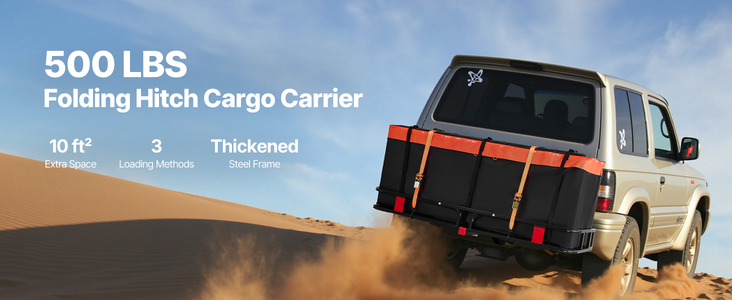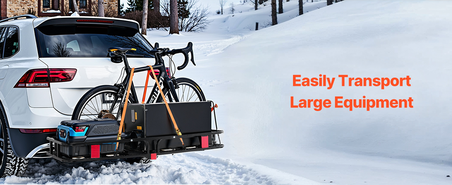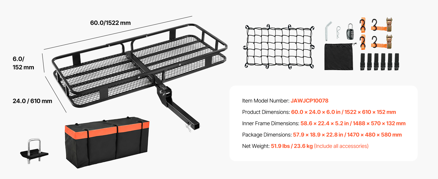 - 500lbs Extra Storage Space: Our hitch cargo carrier measures 60 x 24 x 6 in/1522 x 610 x 152 mm, equipped with bag, cargo net with hooks, ratchet straps, and other accessories, which can be used to load different sizes of cargo. Say goodbye to looseness, and is not easy to fall off.
