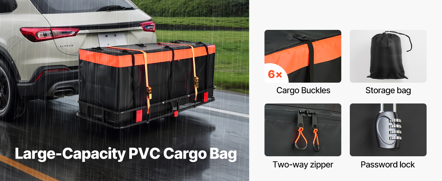 - Waterproof Cargo Bag: Our hitch cargo carrier’s cargo bag measures 57.9 x 18.9 x 22.8 in/1470 x 480 x 580mm. It is equipped with a combination lock, thickened PVC material which is waterproof, snowproof, dustproof and light-resistant. So that the items are no longer organized storage. S ay goodbye to scattered.