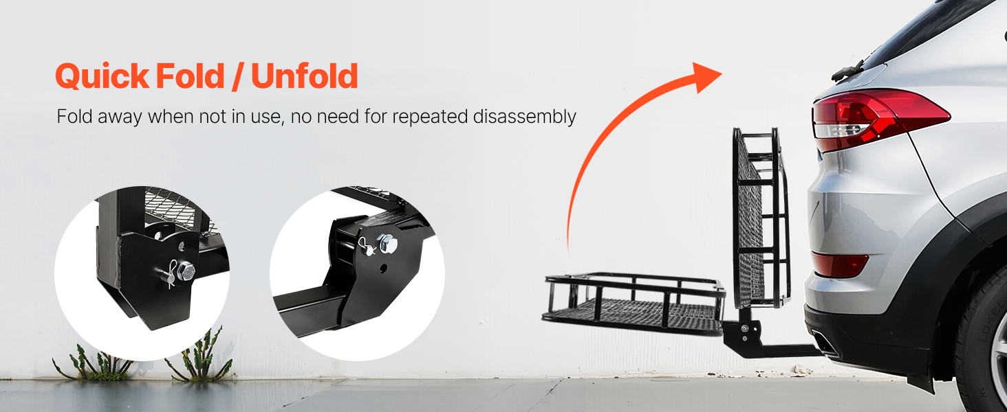 - Foldable: When you don't use our hitch cargo carrier, you can fold the luggage frame 90°by adjusting the pins and latches. No need to disassemble it again and again, and it doesn't take up extra space.