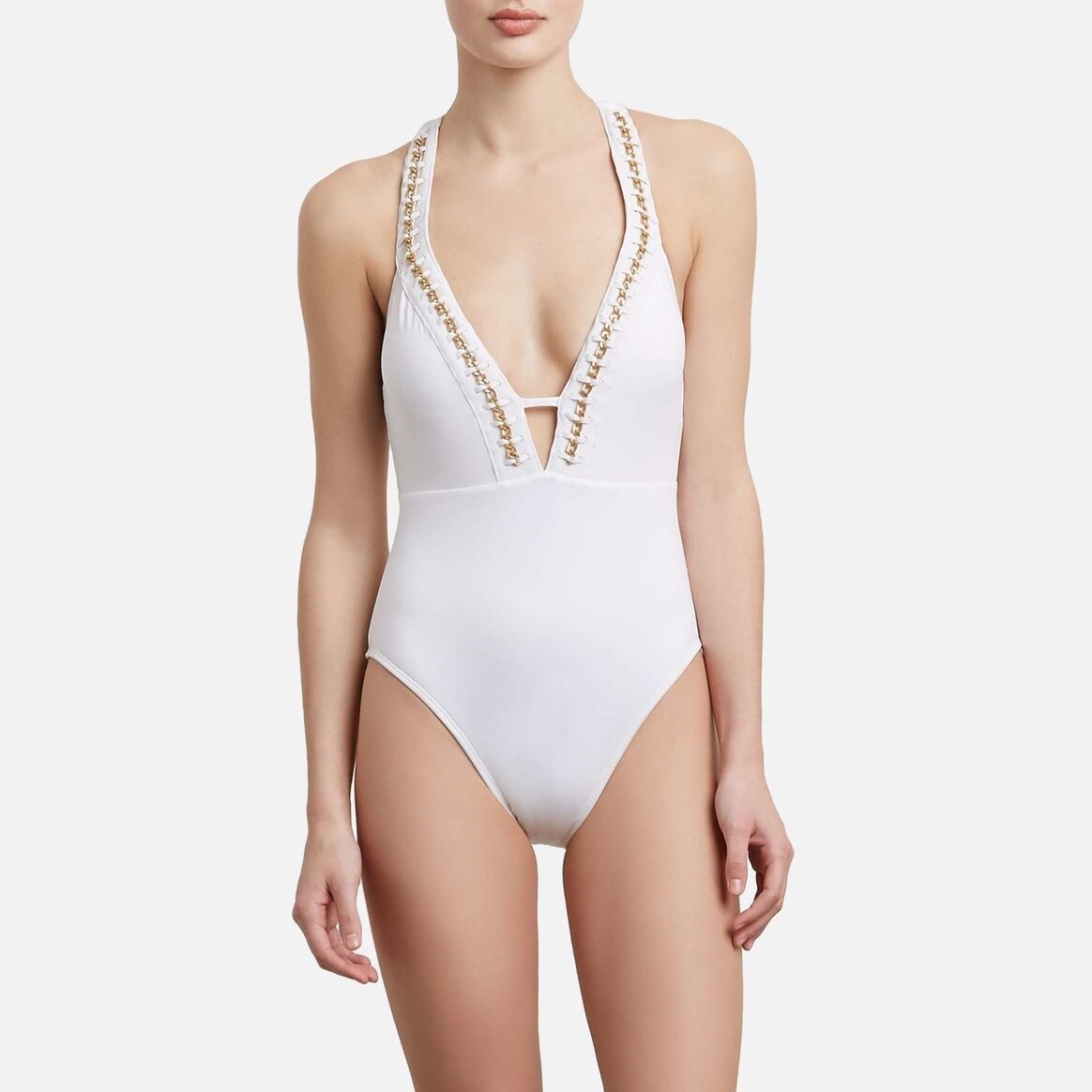 One-piece Adjustable straps Plunge neckline Gold-tone chain detail Features shape enhancing tummy toner technology that provides subtle support and secure fit 84% nylon, 16% elastane Hand wash
