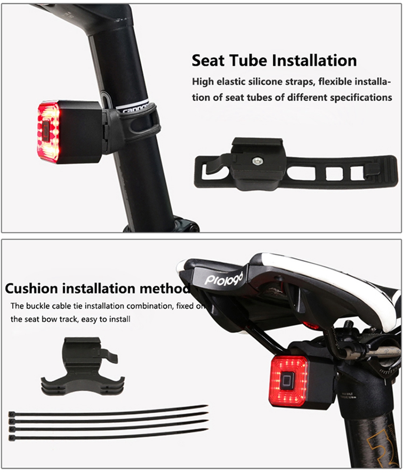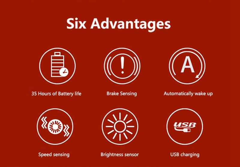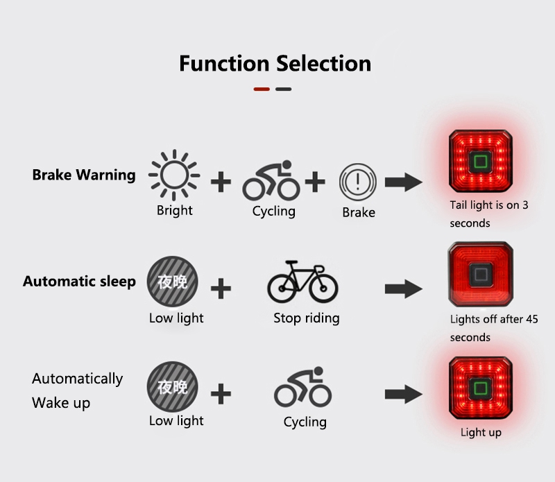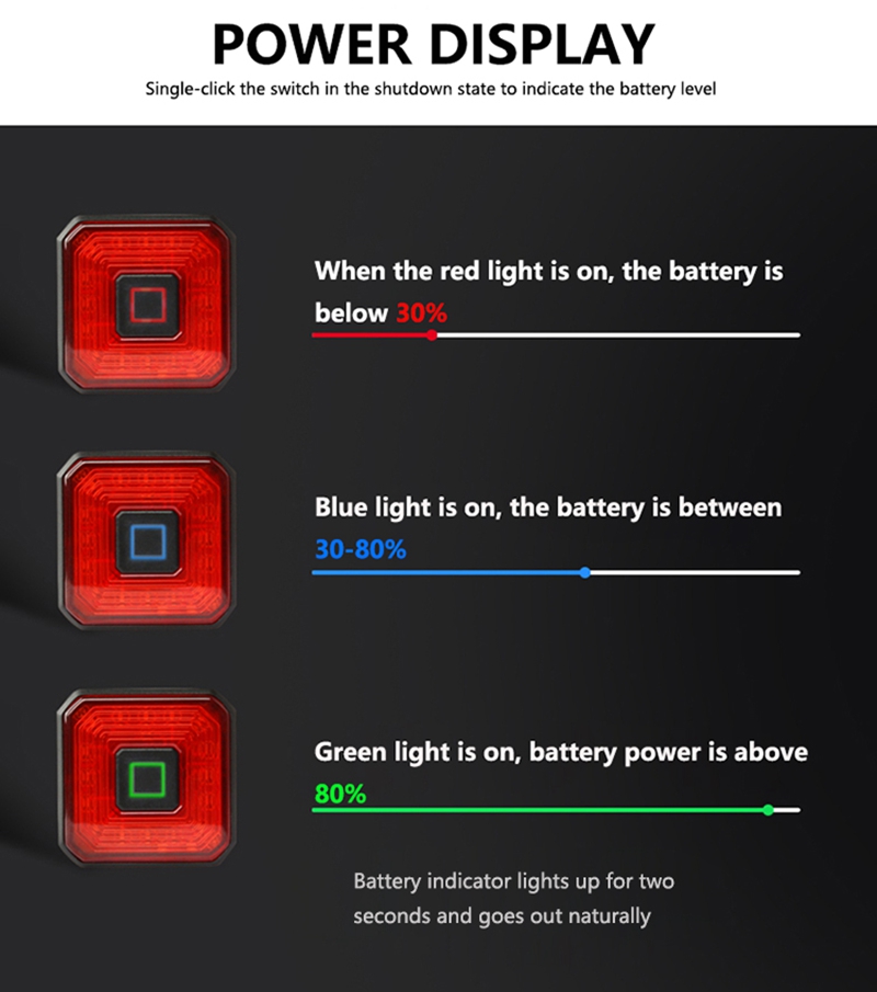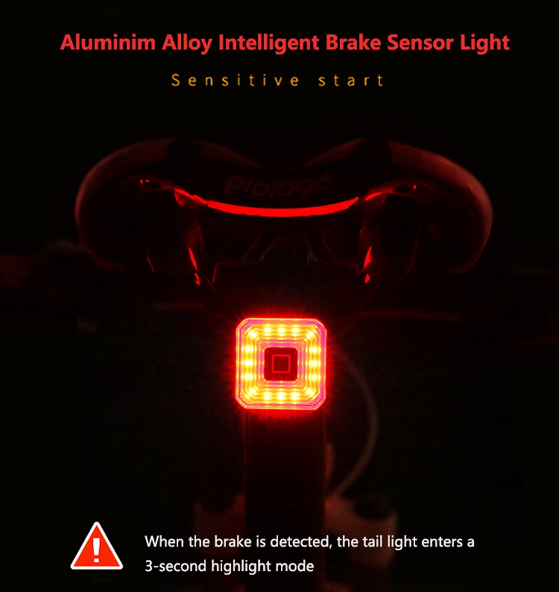 ①Sensitive Activation with Smart Brake Detection: The bike taillight features an aluminum alloy smart brake sensor. When braking is detected, the taillight automatically switches to a high-brightness mode for 3 seconds, enhancing safety.