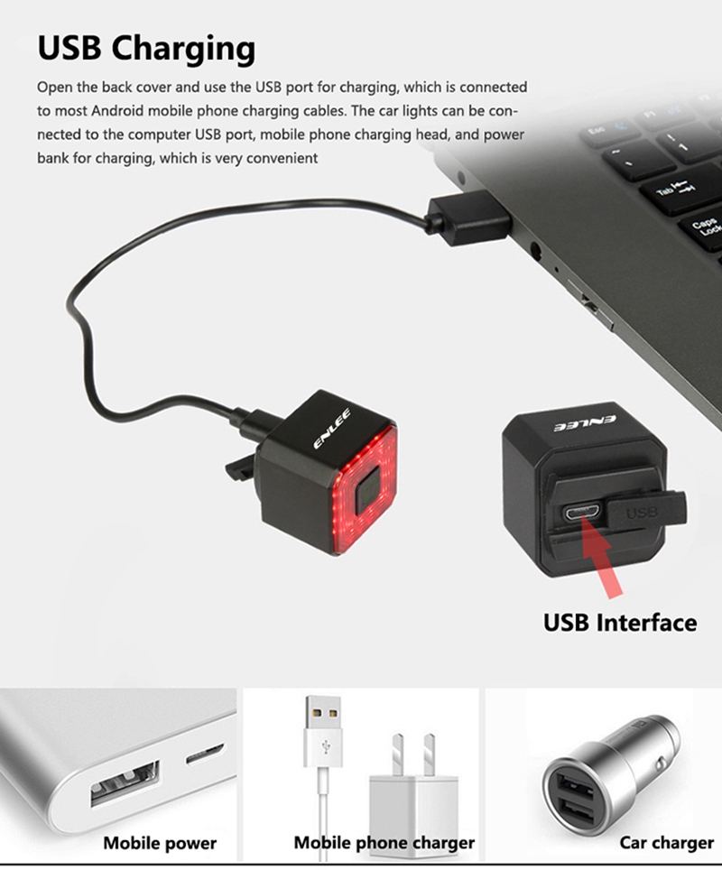 ⑥USB Charging Compatibility: Equipped with a USB charging port, the taillight can be charged using most Android phone cables. It can be connected to a computer USB port, phone charger, or power bank for easy and flexible charging.