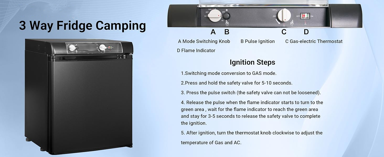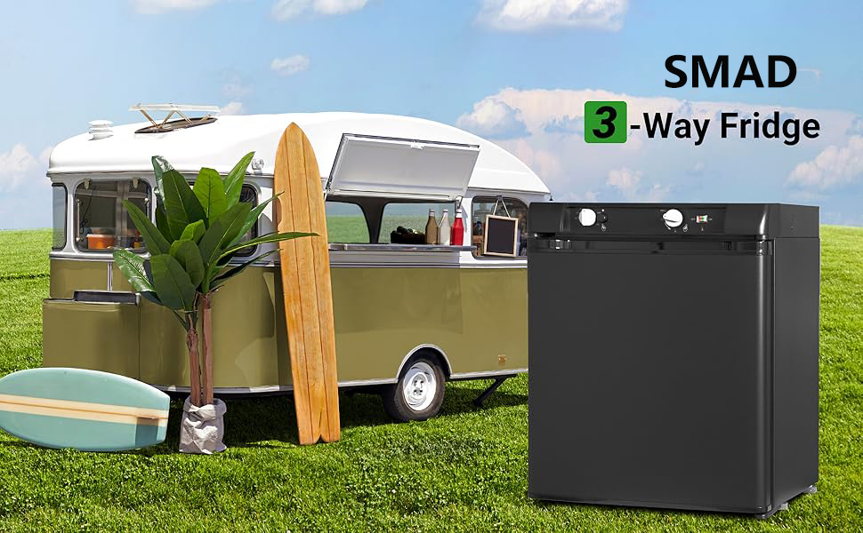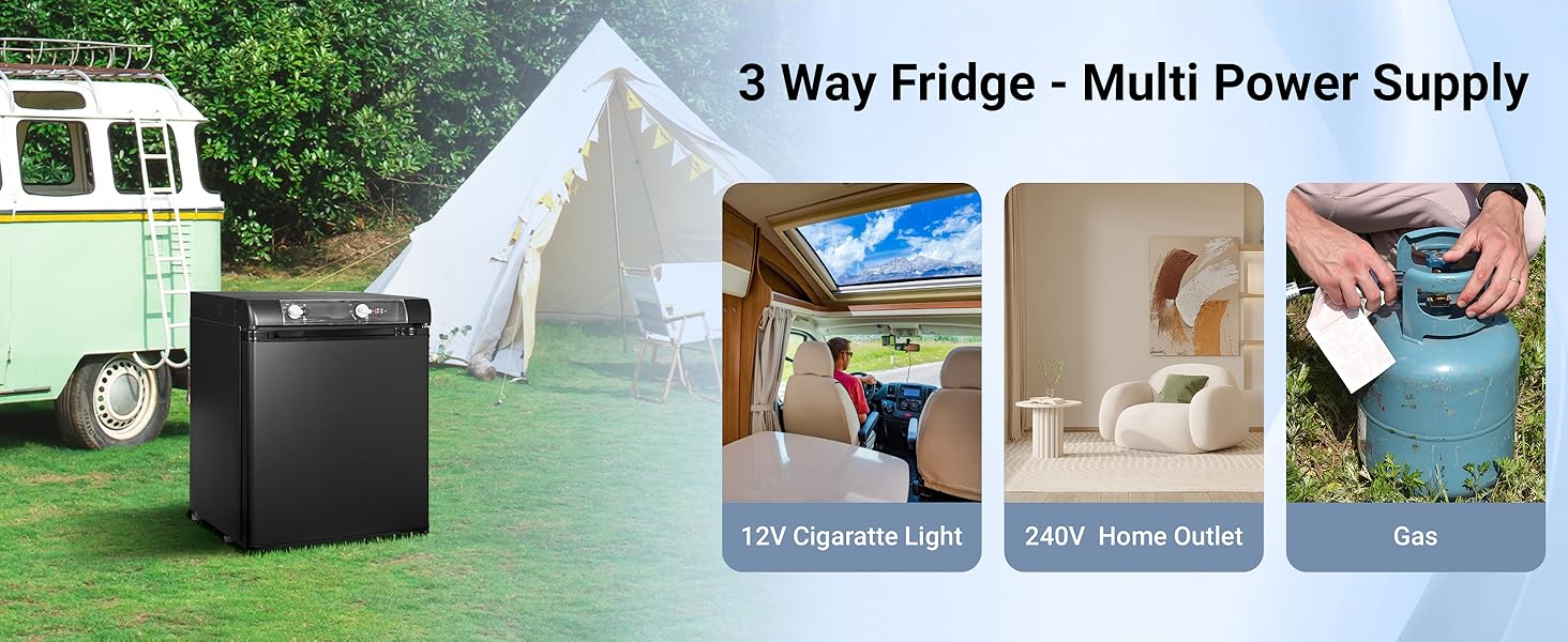 El frigorífico para vehículos recreativos de 3 vías es una unidad de almacenamiento en frío que funciona con tres fuentes de energía diferentes. Dependiendo de sus necesidades, la nevera puede funcionar con propano, DC12V o AC 220v-240V . Rango de temperatura: 32-50 ℉ (0-10℃).